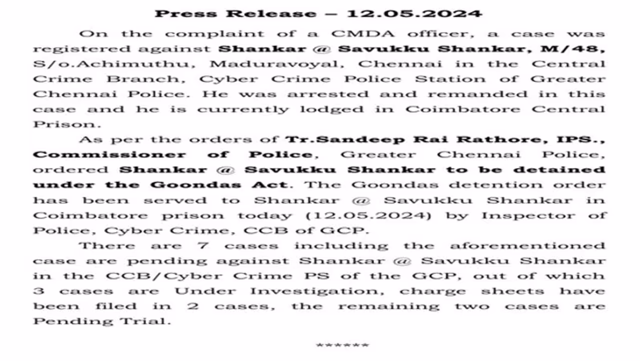 இதுகுறித்த சென்னை காவல்துறையின் செய்திக் குறிப்பில், சவுக்கு சங்கர் மீது 7 வழக்குகள் நிலுவையில் உள்ளதாகவும், அதில் இரண்டு வழக்குகளில் குற்றப்பத்திரிகை தாக்கல் செய்யப்பட்டுள்ளதாகவும், 3 வழக்குகள் மீதான விசாரணை நடைபெற்று வருவதாகவும், மீதமுள்ள 2 வழக்குகள் விசாரணைக்கான நிலுவையில் உள்ளதாகவும் தெரிவிக்கப்பட்டுள்ளது.