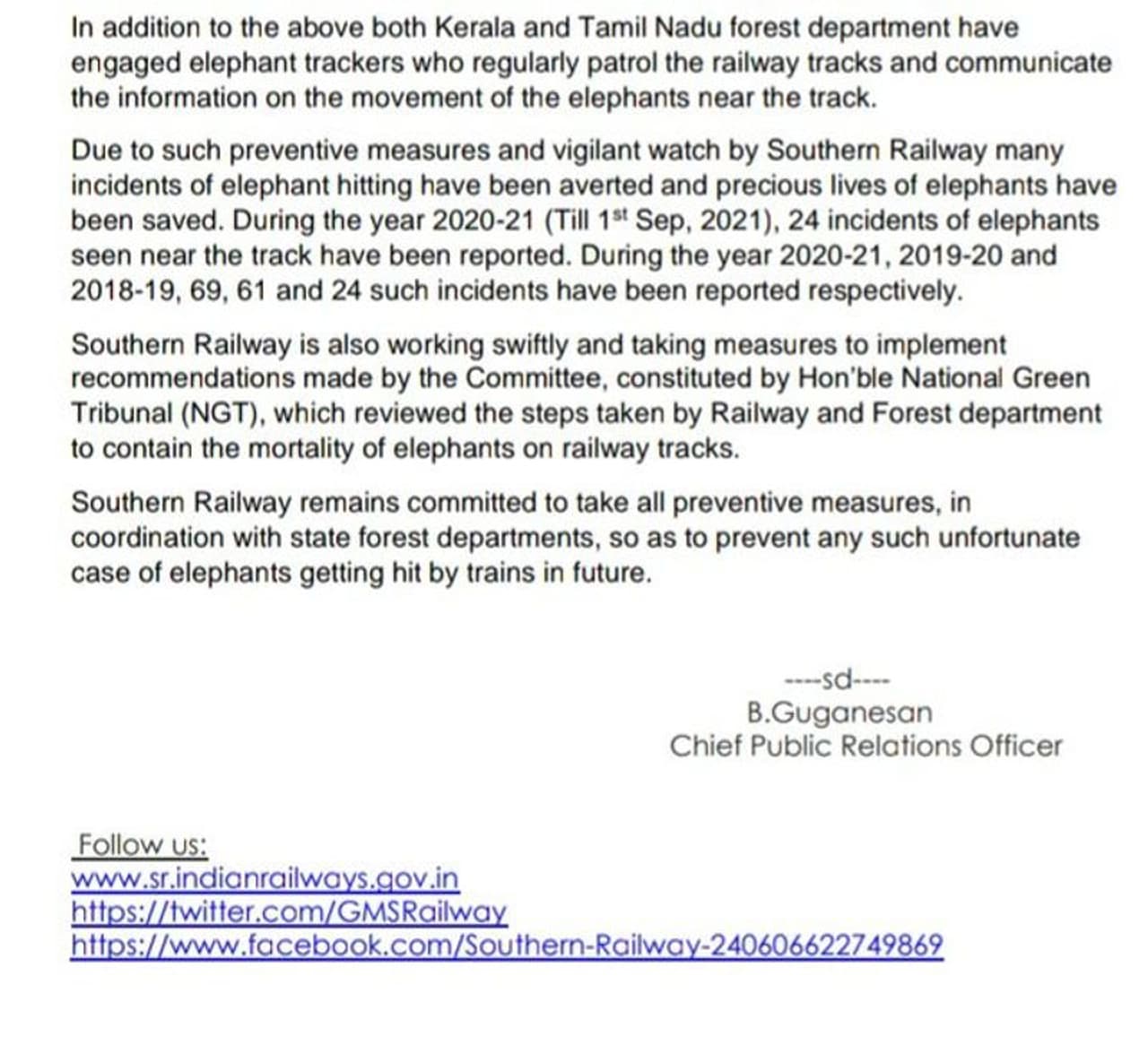 கோவை மதுக்கரை அருகே ரயில்வே தண்டவாளத்தை கடக்க முயன்ற யானைகள் இறந்த விவகாரம் தொடர்பாக வருத்தம் தெரிவித்த தென்னக ரயில்வே.