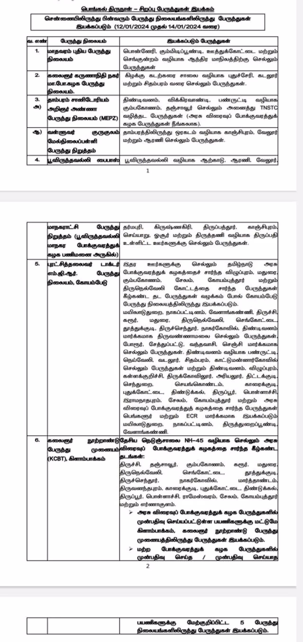 பொங்கல் திருநாளை ஒட்டி பொதுமக்கள் தங்கள் ஊர்களுக்கு பயணம் செய்ய ஏதுவாக, தமிழ்நாடு அரசுப் போக்குவரத்துக் கழகங்கள் மூலம் இன்று (12.01.2024) முதல் 14.01.2024 ஞாயிறு வரை சிறப்பு பேருந்துகள் இயக்கிட ஏற்பாடுகள் செய்யப்பட்டுள்ளது. அதன்படி, கூட்ட நெரிசலை தவிர்க்கும் பொருட்டு பயணிகளின் வசதிக்காக சென்னையின் 6 பேருந்து நிலையங்களிலிருந்து 12.01.2024 முதல் 14.01.2024 வரை பேருந்துகள் இயக்கப்படுகிறது.