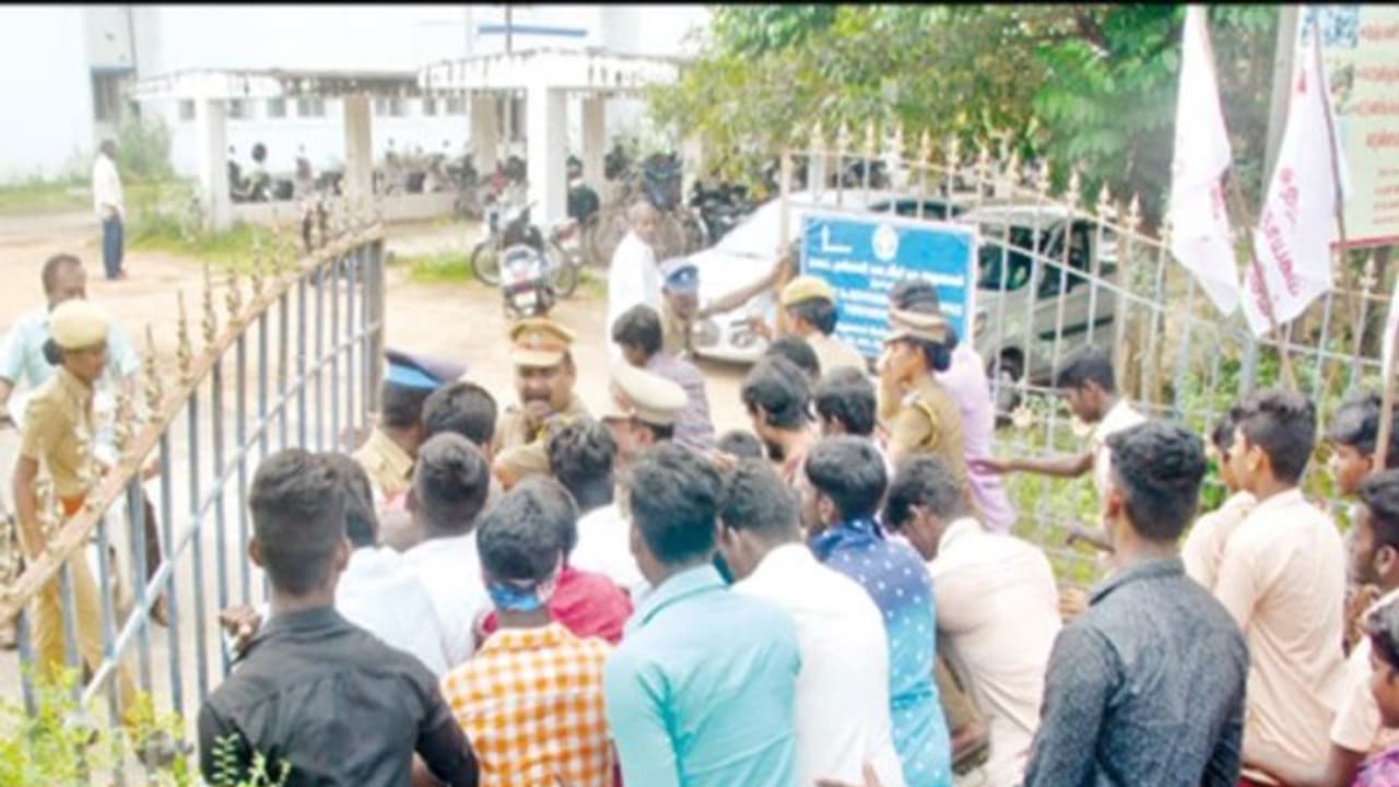 அங்கு அலுவலக வாசல் கதவை மூடி காவலாளர்கள் பாதுகாப்பு பணியில் ஈடுபட்டிருந்தனர். அப்போது இந்திய மாணவர் சங்கத்தினர் உள்ளே நுழைய முயன்றனர். அவர்களை காவலாளர்கள் தடுத்ததால் இருவருக்குமிடையே தள்ளு, முள்ளு ஏற்பட்டது. இதனால் அங்கு பரபரப்பு ஏற்பட்டது.