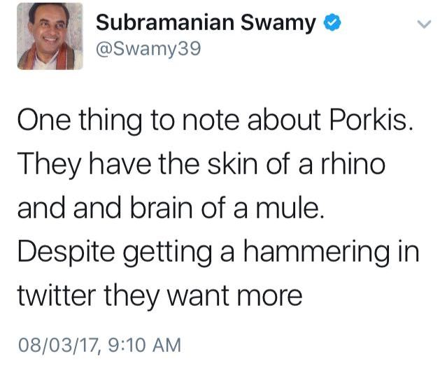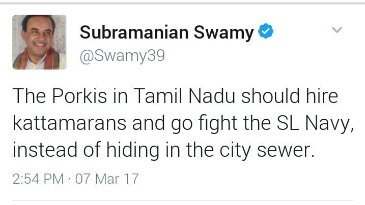 ஒவ்வொரு முறை டுவிட்டரில் பதிவு செய்யும்போது, தமிழர்களை கொச்சை படுத்தி பதிவிடுவதை வழக்கமாக கொண்டுள்ளார் சுப்பிரமணிய சாமி, அவரை கேட்கவோ, கண்டிக்கவோ யாரும் இல்லையா என பொதுமக்கள் வேதனையுடன் கூறுகின்றனர்.