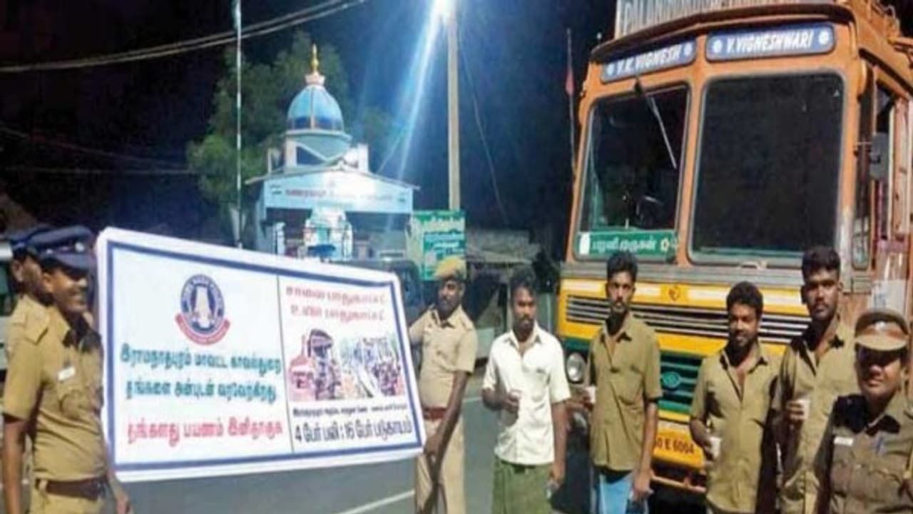 இரவு நேரங்களில் ஏற்படும் விபத்துகளை தவிர்க்க ஓட்டுநர்களுக்கு தூக்கத்தில் இருந்து மீட்கும் வகையில் தேநீர் மற்றும் குடிநீர் வழங்கி, புத்துணர்ச்சியை அளிக்கின்றனர் காவலாளர்கள்.