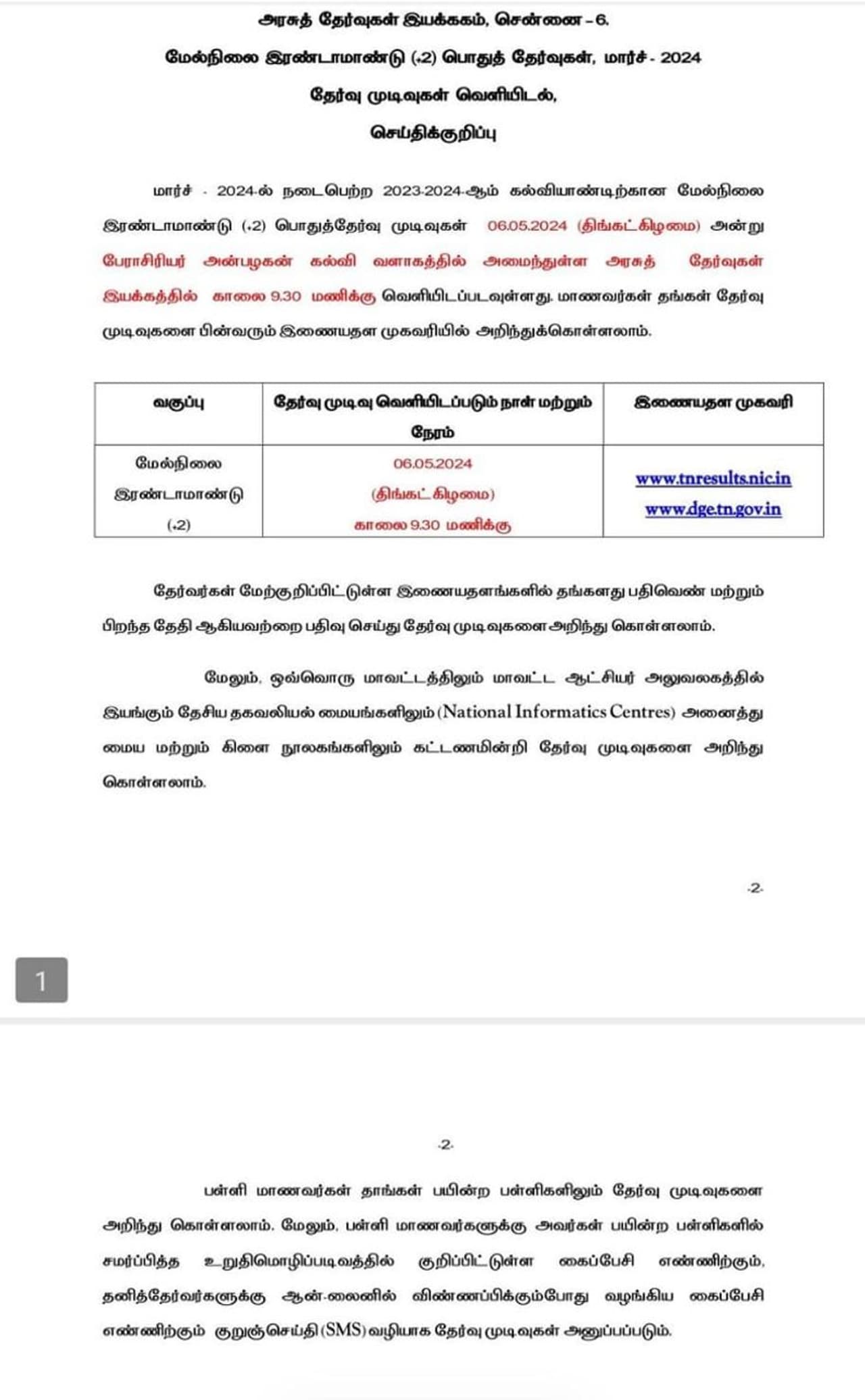 இந்நிலையில் திட்டமிட்டபடி 12ஆம் வகுப்பு தேர்வு முடிவுகள் இன்று காலை 9.30 மணி அளவில் வெளியிடப்பட உள்ளது. தேர்வு முடிவுகளை மாணவர்கள் www.dge.tn.gov.in மற்றும் www.tnresults.nic.in ஆகிய இணையதளங்களில் தங்களின் தேர்வு முடிவுகளை பார்த்துக் கொள்ளலாம். இந்த இணையதளத்தில் மாணவர்களின் கால் டிக்கெட் நம்பர் மற்றும் பிறந்த தேதியை பதிவு செய்து மதிப்பெண்களை பார்த்துக்கொள்ளலாம்.மேலும் மாணவர்கள் எமிஸ் இணையதளத்தில் பதிவு செய்த தொலைபேசி எண்ணுக்கும் தேர்வு முடிவுகள் குறுஞ்செய்தியாக அனுப்பப்படும் என பள்ளிக்கல்வித் துறை அறிவித்துள்ளது.