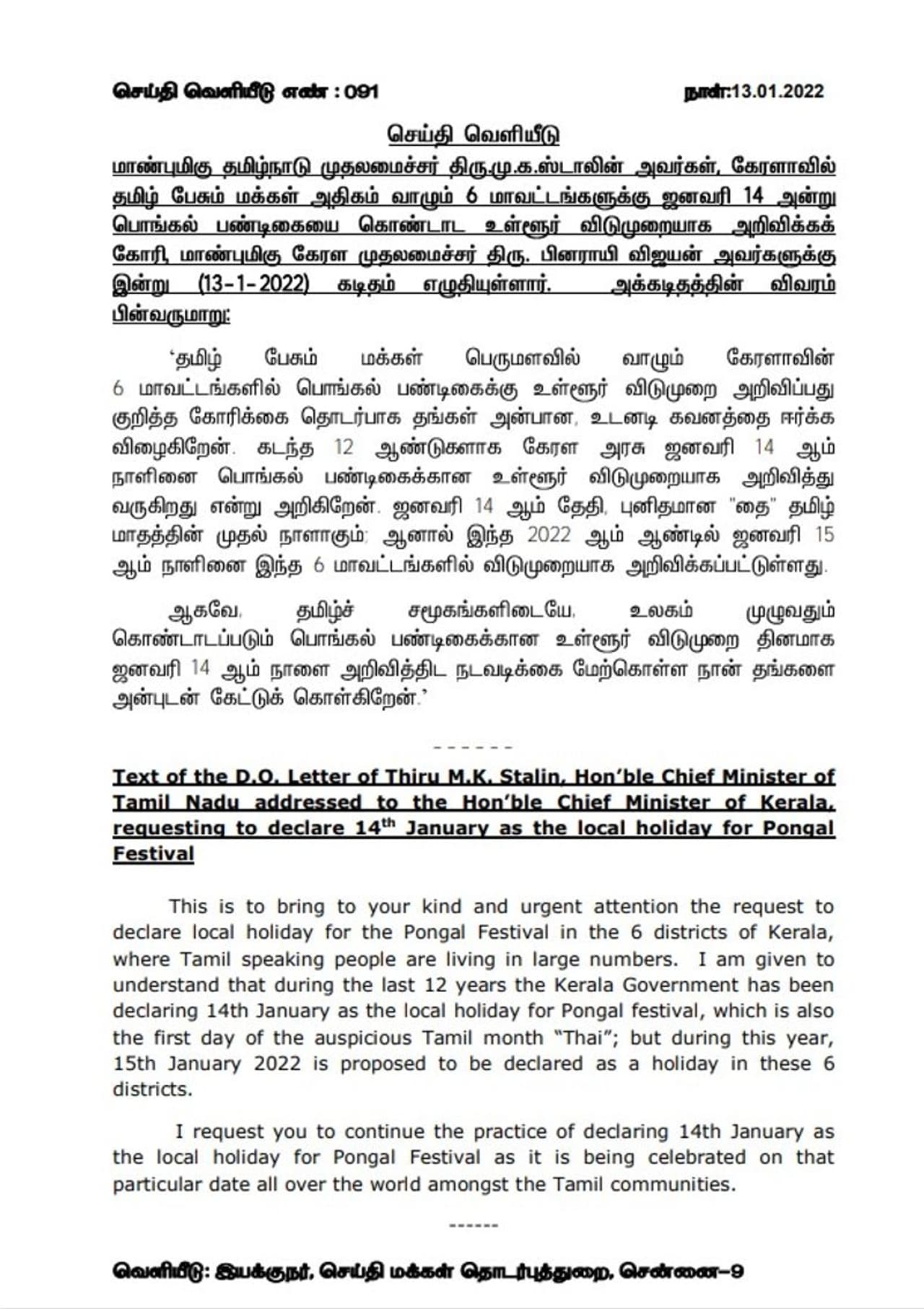 இந்நிலையில் நாளை தமிழர் திருநாளாம் பொங்கல் திருநாள் உலகம் முழுவதும் கொண்டாப்படவுள்ள நிலையில் கேரளாவில் தமிழ் பேசும் மக்கள் அதிகம் வாழும் 6 மாவட்டங்களுக்கு ஜனவரி 14 அன்று பொங்கல் பண்டிகையை கொண்டாட உள்ளூர் விடுமுறையாக அறிவிக்கக்கோரி, தமிழக முதல்வர் ஸ்டாலின், கேரள முதலமைச்சர் பினராயி விஜயனுக்கு கடிதம் எழுதியுள்ளார்.