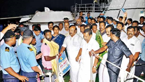 இதையடுத்து தமிழக மீனவர்கள் 77 பேர் இந்திய கப்பலில் ஏற்றி காரைக்கால் துறைமுகம் அழைத்து வரப்பட்டனர். அவர்களை அமைச்சர்கள் ஜெயகுமார், ஒ.எஸ். மணியன் மற்றும் அதிகாரிகள் வரவேற்றனர்.இதனைத் தொடர்ந்து செய்தியாளர்களிடம் பேசிய மீனவர்கள் இலங்கை சிறைகளில் தாங்கள் மிகவும் கொடுமைப்பட்டதாக தெரிவித்தனர்.