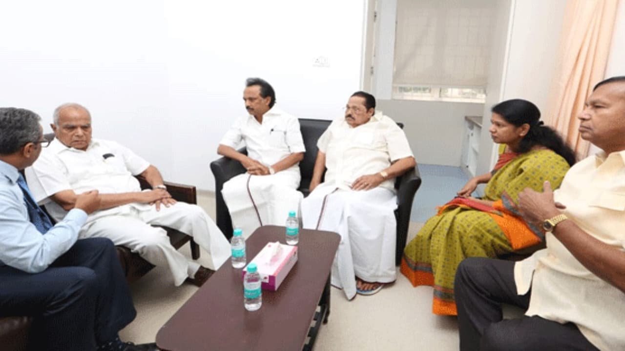 Tamil Nadu governor Banwarilal Purohit visits DMK President M Karunanidhi at Kauvery Hospital who was admitted to the hospital late last night following drop in blood pressure