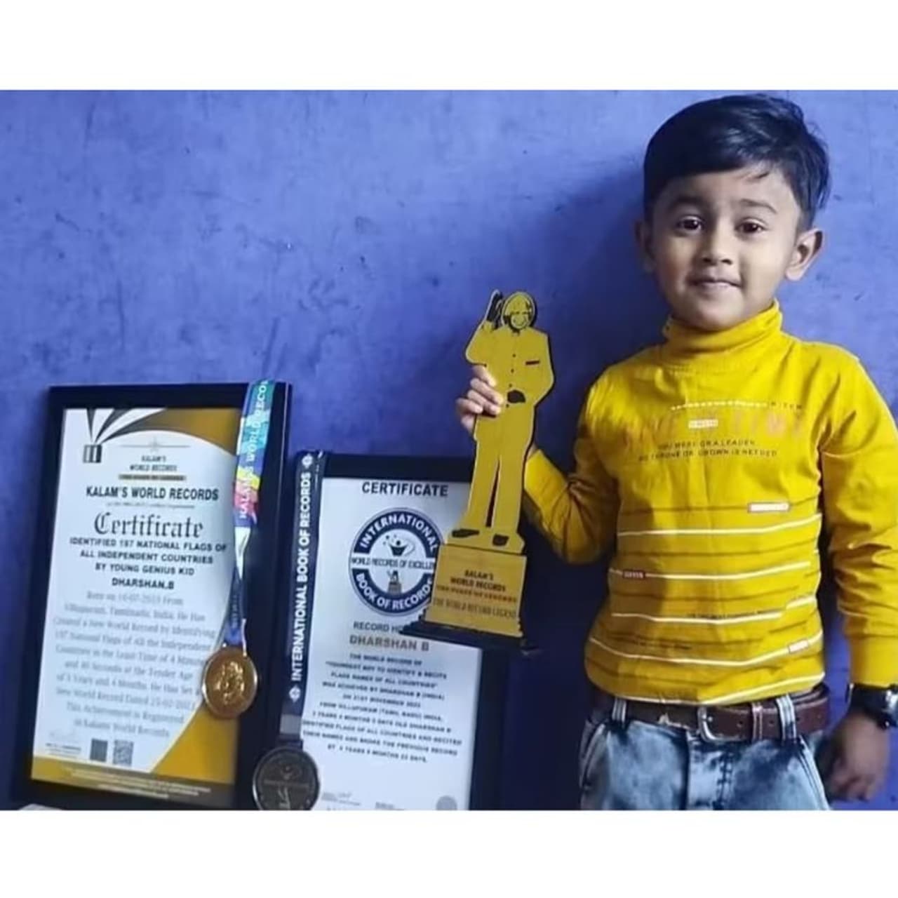 தமிழ்நாட்டின் விழுப்புரம் மாவட்டம் ஜீவா நகர் பகுதியைச் சேர்ந்த தர்ஷன், தற்போது தனியார் பள்ளியில் எல்.கே.ஜி.யில் சேர்ந்துள்ளார். முன்னதாக, 4 வயது இந்திய சிறுவன் ஒருவன் கொடிகளால் நாடுகளை அடையாளம் கண்டு சர்வதேச சாதனை செய்துள்ள நிலையில், அதன் சாதனையை தர்ஷன் முறியடித்துள்ளார். டெல்லியில் உள்ள சர்வதேச சாதனை புத்தக குழு விழுப்புரம் சிறுவனின் சாதனையை பாராட்டி சான்றிதழும், பதக்கமும் வழங்கியது.