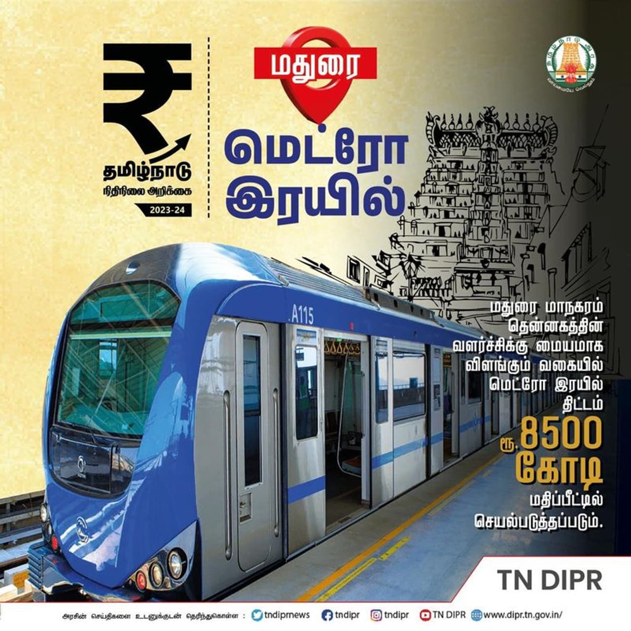 கோவையில் மெட்ரோ ரயில் திட்டம் ரூ.9000 கோடி மதிப்பீட்டில் செயல்படுத்தப்படும். மதுரையில் ரூ.8500 கோடி செலவில் மெட்ரோ ரயில் திட்டம் செயல்படுத்தப்படும் என தமிழ்நாடு பட்ஜெட்டில் அறிவிக்கப்பட்டுள்ளது.