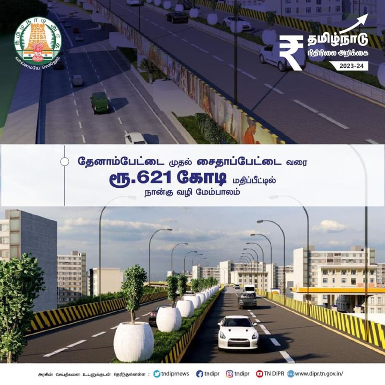 சென்னை தேனாம்பேட்டை முதல் சைதாப்பேட்டை வரை அண்ணா சாலையில் 4 வழி சாலையாக மேம்பாலம் கட்டப்படும். சர்வதேச நிபுணர்களின் கருத்துக்கள் பெறப்பட்டு, நவீன அம்சங்களுடன் இந்த மேம்பாலம் கட்டப்படும் என தமிழ்நாடு பட்ஜெட்டில் அறிவிக்கப்பட்டுள்ளது.