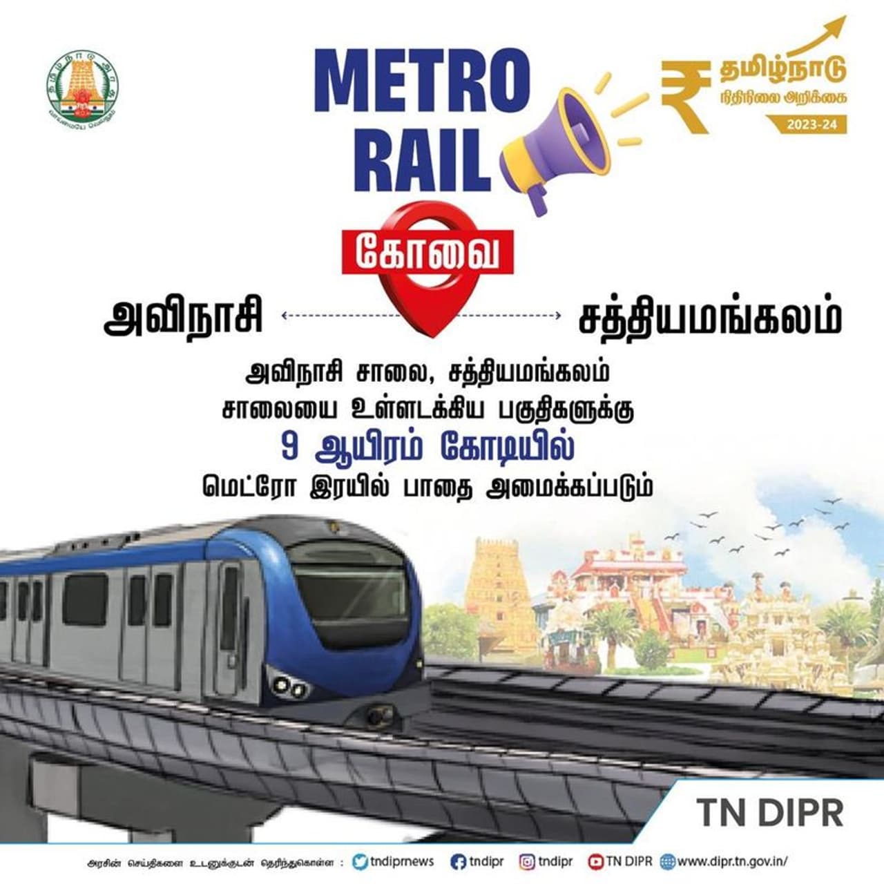 கோவையில் மெட்ரோ ரயில் திட்டம் ரூ.9000 கோடி மதிப்பீட்டில் செயல்படுத்தப்படும்