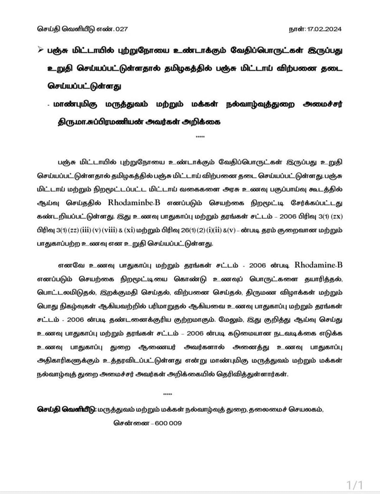 இதுதொடர்பாக மருத்துவம் மற்றும் மக்கள் நல்வாழ்வுத்துறை அமைச்சர் மா.சுப்பிரமணியன் வெளியிட்டுள்ள அறிக்கையில்: பஞ்சு மிட்டாயில் புற்றுநோயை உண்டாக்கும் வேதிப்பொருட்கள் இருப்பது உறுதி செய்யப்பட்டுள்ளதால் தமிழகத்தில் பஞ்சு மிட்டாய் விற்பனை தடை செய்யப்பட்டுள்ளது. பஞ்சு மிட்டாய் மற்றும் நிறமூட்டப்பட்ட மிட்டாய் வகைகளை அரசு உணவு பகுப்பாய்வு கூடத்தில் ஆய்வு செய்ததில் Rhodaminbe-B எனப்படும் செயற்கை நிறமூட்டி சேர்க்கப்பட்டது கண்டறியப்பட்டுள்ளது. இது உணவு பாதுகாப்பு மற்றும் தரங்கள் சட்டம் -2006 பிரிவு 3(1) (ZX) பிரிவு 3 (1 ) (zz)(iii) (v) (viii) & (xi)மற்றும் 26(1) (2) (ixii) & (v) – ன் படி தரம் குறைவான மற்றும் பாதுகாப்பற்ற உணவு என உறுதி செய்யப்பட்டுள்ளது.