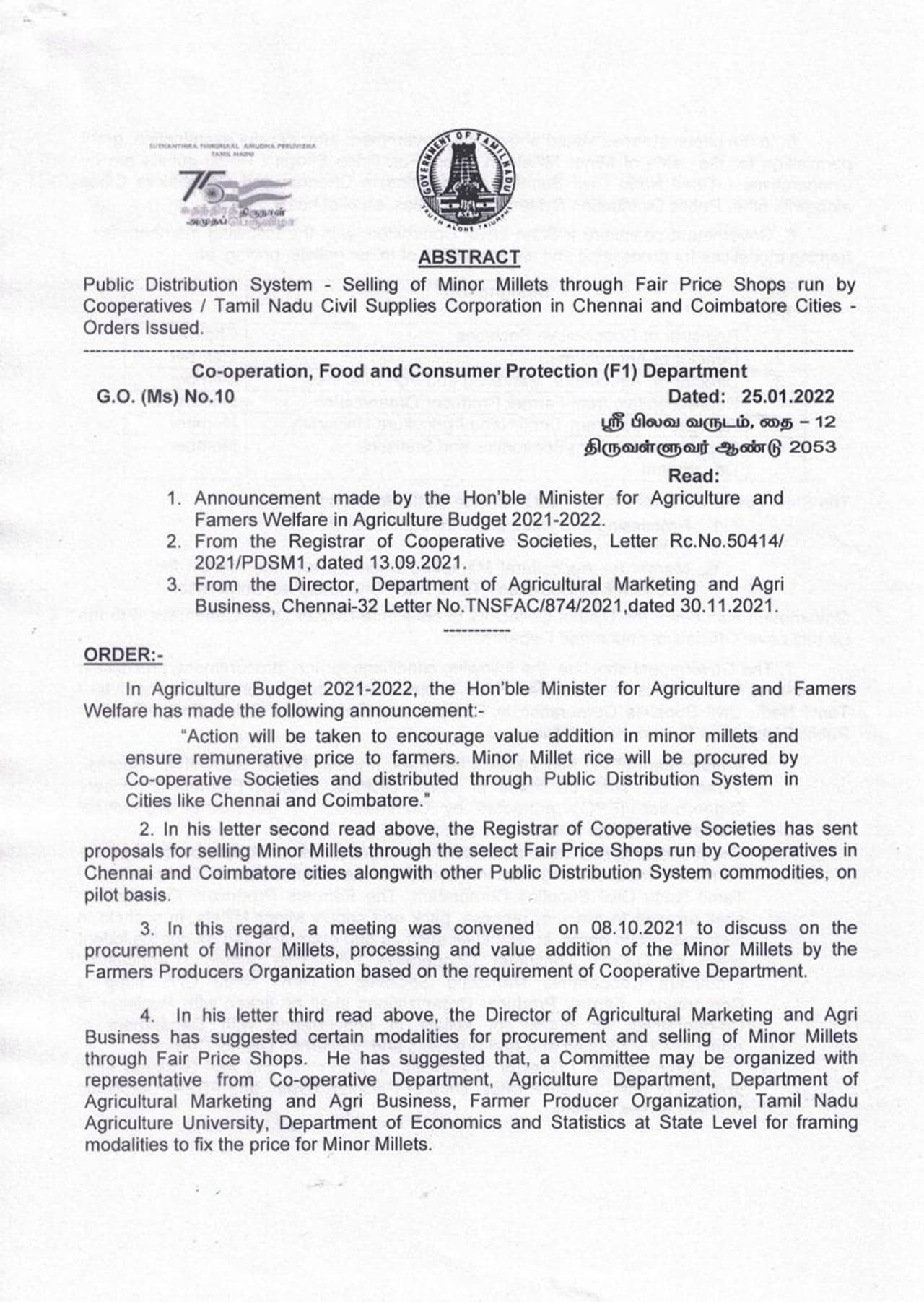 மேலும், சிறுதானியங்களின் விலையை நிர்ணயம் செய்ய கூட்டுறவு சங்க பதிவாளர் தலைமையில் குழு அமைத்தும் உத்தரவிட்டுள்ளது. விவசாயிகளுக்கு வருவாய் கிடைக்கவும், சிறு தானியங்களின் மதிப்பை கூடவும் தமிழக அரசு நடவடிக்கை எடுக்கப்பட்டுள்ளது என்பது குறிப்பிடத்தக்கது.