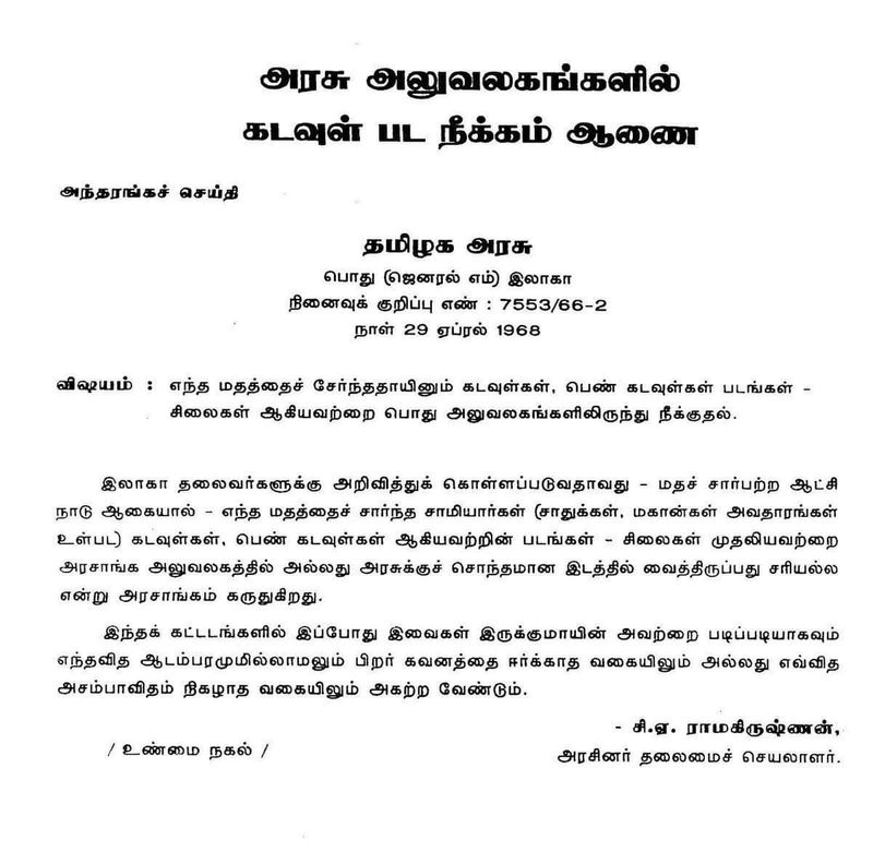 அனைத்து அரசு அலுவலகங்களிலும் கடவுள், மதம் குறித்த எந்த புகைப்படமோ அல்லது சிலைகளோ அல்லது மதத்திற்குரிய வழிபாடோ இருக்க கூடாது என்பதற்கான அரசாணையை தற்போது தமிழக அரசு வெளியட்டுள்ளது.