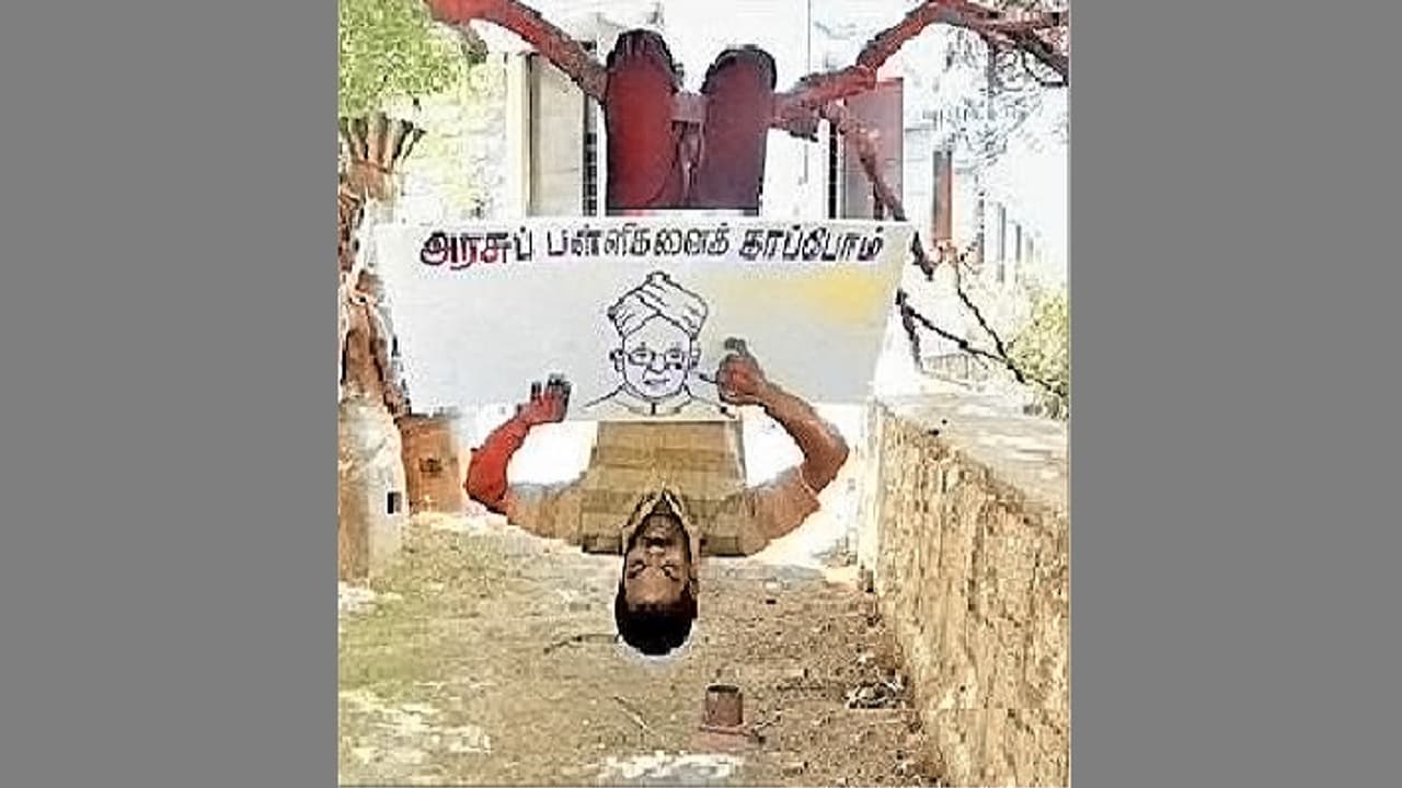 "அரசுப் பள்ளிகளை பாதுகாக்க வேண்டும்" என்று வாசகத்துடன் கூடிய டாக்டர். ராதாகிருஷ்ணன் படத்தை மரத்தில் தலைகீழாகத் தொங்கியபடி வரைந்து மக்கள் மற்றும் அரசிடையே விழிப்புணர்வை ஏற்படுத்தியுள்ளார் இந்த பகுதிநேர பள்ளி ஓவிய ஆசிரியர்.