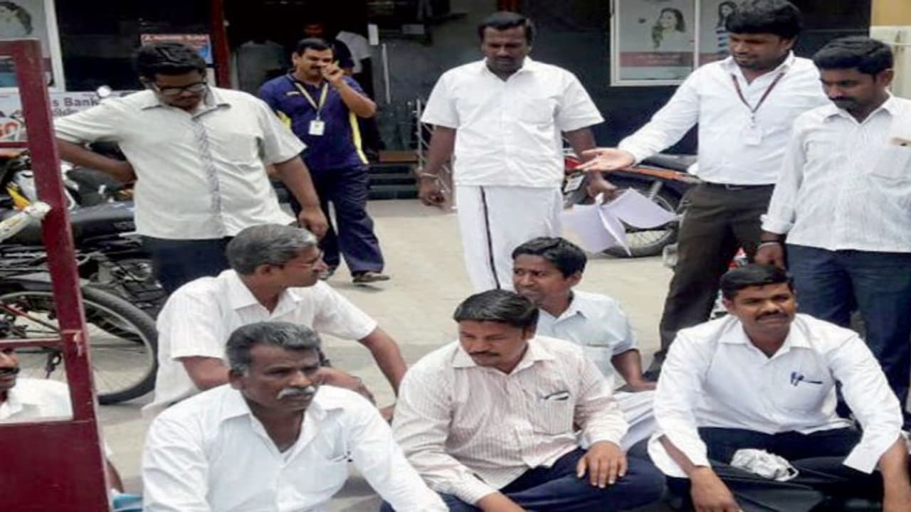 பின்னர் வெளியே வந்த முருகையன் தான் கொண்டு வந்திருந்த 10 ரூபாய் நாணயங்களை வங்கி முன்பு கொட்டிவிட்டு, தனது நண்பர்களுடன் போராட்டத்தில் ஈடுபட்டார்.