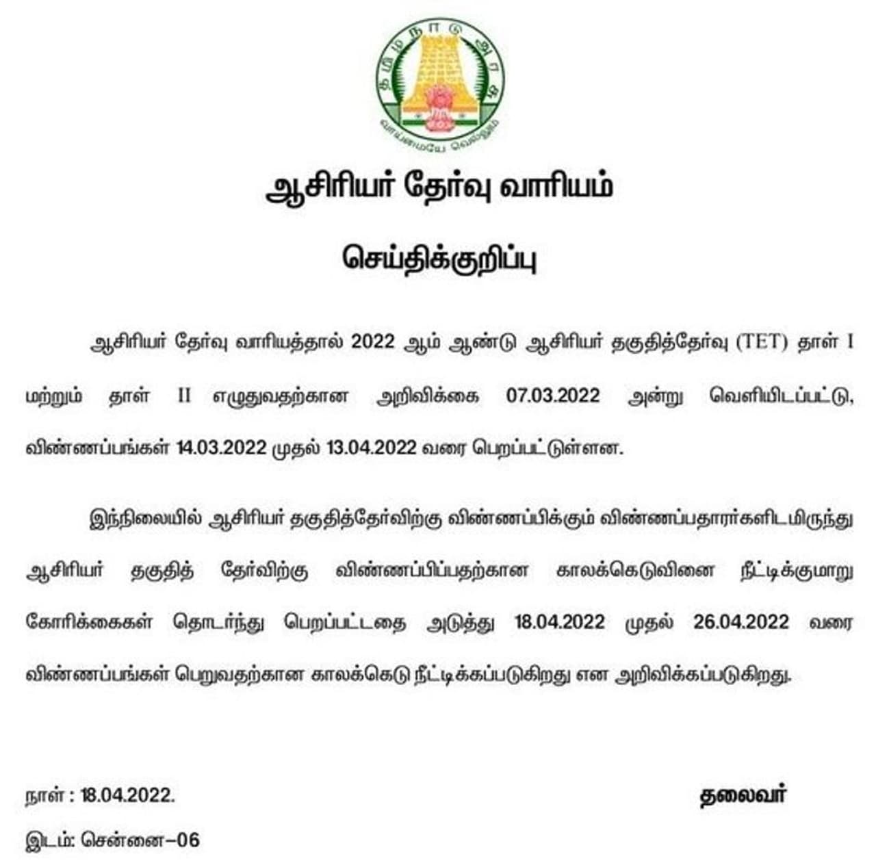 இதுக்குறித்து வெளியிடப்பட்டுள்ள அறிவிப்பில்,”ஆசிரியர் தேர்வு வாரியத்தால் 2022 ஆம் ஆண்டு ஆசிரியர் தகுதி தேர்வு (TET) தாள்1 மற்றும் தாள் 2 எழுதுவதற்கான அறிவிக்கை 07.03.2022 அன்று வெளியிடப்பட்டு விண்ணப்பங்கள் 14.03.2022 முதல் 13.04.2022 வரை பெறப்பட்டன. இந்நிலையில் ஆசிரியர் தகுதி தேர்விற்கு விண்ணப்பிக்கும் விண்ணப்பதாரர்களிடமிருந்து ஆசிரியர் தகுதித் தேர்விற்கு விண்ணப்பிக்கும் காலகெடுவினை நீட்டிக்குமாறு கோரிக்கைகள் தொடர்ந்து பெறப்பட்டதையடுத்து 18.04.2022 அன்று முதல் 26.04.2022 வரை விண்ணப்பங்கள் பெறுவதற்கான கால அளவு நீட்டிக்கப்படுகிறது என அறிவிக்கப்படுகிறது என்று அதில் குறிப்பிடப்பட்டுள்ளது.