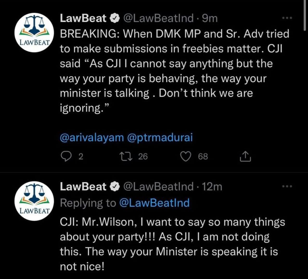 ஆட்சிக்கு வருவதற்கு முன் மாநிலத்தின் பொருளாதார நிலையை எவ்வாறு ஒரு கட்சி அறிந்திருக்கும்? இந்த விவகாரத்தில் தேர்தல் இலவசம் என்பதை அனைத்து தரப்பும் ஒரு பிரச்சனையாக கருதுகிறீர்கள்?ஆனால் தேர்தல் இலவசத்தை தாண்டி அரசின் கொள்கை முடிவு, திட்டங்கள் என்ற பெயரில் இலவசங்கள் அறிவிக்கப்படுகிறது அதுவும் கவனிக்கப்பட வேண்டியது, சரிபடுத்தப்பட வேண்டியது ஆகும், எனவே இந்த விவகாரத்தை பொறுத்தவரை இரண்டையும் பிரித்து பார்க்க முடியாது எனவே தான் இந்த இலவசங்கள் விவகாரத்தை கையில் எடுக்கும்போது அதன் மூலம் பாராளுமன்றத்தில் விவாதிக்கப்பட வேண்டும் என நினைத்தோம், மேலும் இலவசங்கள் தொடர்பான விவகாரத்தில் ஒரு ஆணையம் அமைக்கலாம் என நினைத்தோம், ஏனெனில் இலவசங்கள் அறிவிப்பு தொடர்பாக பாராளுமன்றத்தில் விவாதம் நடந்தால் அதற்கு இந்த ஆணையம் உதவிகரமாக இருக்கும் என கூறினார். அந்நேரத்தில் தி.மு.க தரப்பு மூத்த வழக்கறிஞர் பி.வில்சன் தனது தரப்பு வாதத்தை வைக்க முற்பட்டார். அப்போது தலைமை நீதிபதி தி.மு.க தரப்பு மூத்த வழக்கறிஞர் வில்சனிடம் இந்த வழக்கில் நீங்கள் ஆதரவாக களமிறங்கும் தி.மு.க கட்சி மட்டும்தான் மிகவும் சாதுர்யமான, புத்திசாலித்தனமான கட்சி என்று நினைக்க வேண்டாம். எனக்கு இது தொடர்பாக பல விசயங்கள் கூற வேண்டியுள்ளது. மேலும் பல்வேறு விவகாரங்கள் குறித்து கேட்டும் அது குறித்து பேசாமல் தவிர்ப்பதால் அவற்றை குறித்து அறியாமல் இல்லை என்று நினைக்க வேண்டாம் என காட்டமாக தெரிவித்தார்.