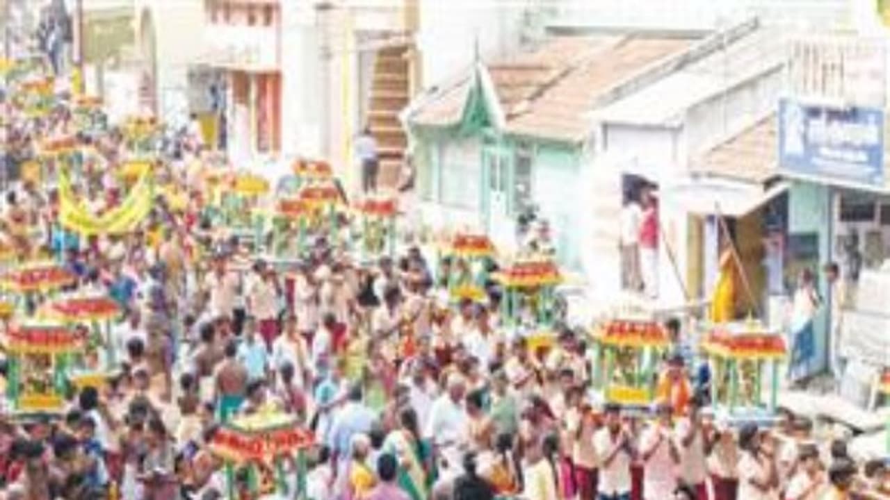 திருவண்ணாமலை அருணாசலேசுவரர் கோயில் கார்த்திகை தீபத் திருவிழாவையொட்டி 63 நாயன்மார்கள் வீதியுலாவில் நாயன்மார்களை இருந்த பல்லக்குகளை பள்ளி சீருடையில் சிறுவர்கள் தூக்கிச் சென்றனர்.