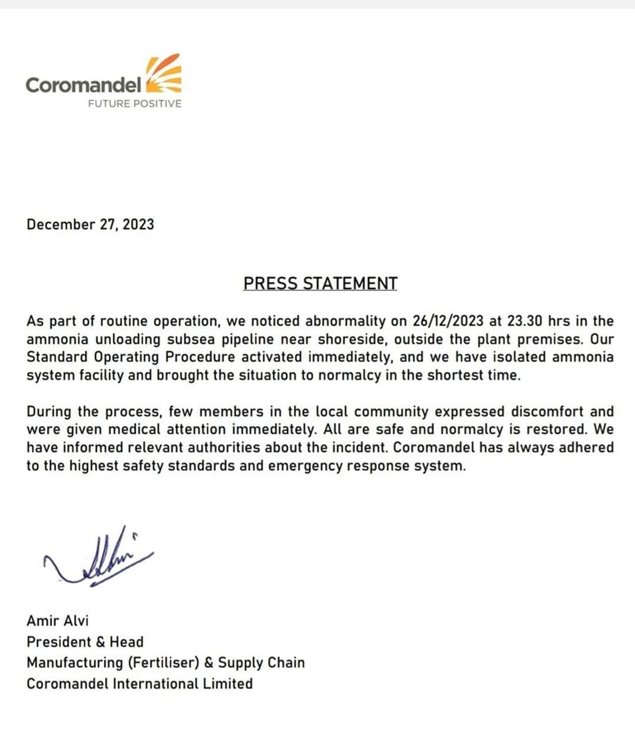 தற்போது அனைவரும் பாதுகாப்பாக உள்ளனர். தொழிற்சாலை மற்றும் சுற்றுப்புற பகுதிகளில் இயல்பு நிலை திரும்பியுள்ளது. இந்த வாயு கசிவு சம்பவம் குறித்து சம்பந்தப்பட்ட அதிகாரிகளிடம் தெரிவித்துள்ளோம். கோரமண்டல் நிறுவனம் எப்பொழுதும் மிக உயர்ந்த பாதுகாப்பு தரநிலைகள் மற்றும் அவசரகால திட்டத்தை முறையை கடைபிடிக்கிறது என கோரமண்டல் தலைவர் அமீர் அல்வி அறிக்கை வெளியிட்டுள்ளார்.