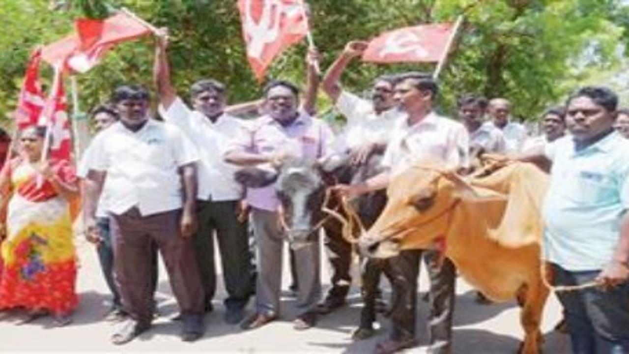 “மத்திய அரசு மாட்டுக்கறிக்கு விதித்த தடையை ரத்து செய்ய வேண்டும்” என விவசாயிகள் சங்கச் செயலர் கே.பி.பெருமாள், நிர்வாகிகள் முத்து, சங்கரன் உள்ளிட்டோர் முழக்கங்களை எழுப்பினர்.