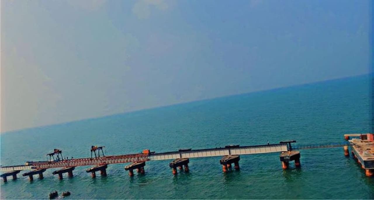பாம்பன் தீவையும், ராமேஸ்வரத்தையும் இணைக்கும் புதிய பாம்பன் ரயில் பாலத்தின் பணிகள் ஏறக்குறைய 84 சதவீதம் முடிந்துவிட்டன. இதற்கான புகைப்படங்களை ரயில்வே வெளியிட்டுள்ளது.