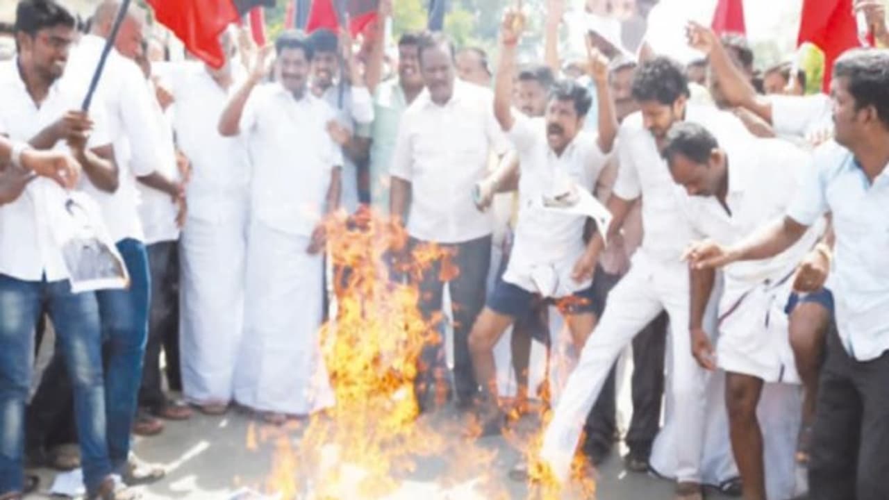 அரியலூர் மாவட்டம் வி.கைகாட்டி சந்திப்புப் பகுதியில் திமுக-வினர், புதிய தமிழகம் கட்சி தலைவர் மருத்துவர் கிருஷ்ணசாமியின் உருவப் பொம்மையை எரித்து நேற்று ஆர்ப்பாட்டம் நடத்தினர்.