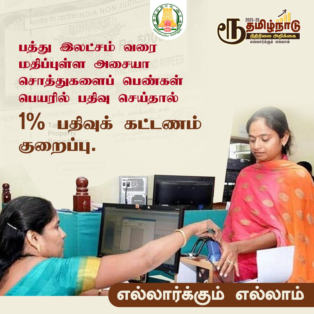 அதன் தொடர்ச்சியாக, சமூகத்தில் மட்டுமன்றி, அவரவர் குடும்பங்களிலும் மகளிருக்கான சமபங்கை உறுதி செய்திடும் வகையில், வரும் 01-04-2025 முதல், 10 இலட்சம் ரூபாய் வரையிலான மதிப்புள்ள வீடு, மனை, விவசாய நிலம் உள்ளிட்ட அனைத்து அசையாச் சொத்துகள், பெண்கள் பெயரில் பதிவு செய்யப்பட்டால், அத்தகைய ஆவணங்களுக்கு பதிவுக் கட்டணம் ஒரு சதவீதம் குறைக்கப்படும். தற்போது மேற்கொள்ளப்படும் பத்திரப் பதிவுகளில் 75 சதவீத பதிவுகள் இந்த அறிவிப்பினால் பயன்பெற இயலும். இதன் மூலம், மகளிரின் சுயசார்பும் பொருளாதாரச் சுதந்திரமும் மேலும் உயர்ந்திடும் என்று இந்த அரசு நம்புகிறது என தெரிவித்துள்ளா்.