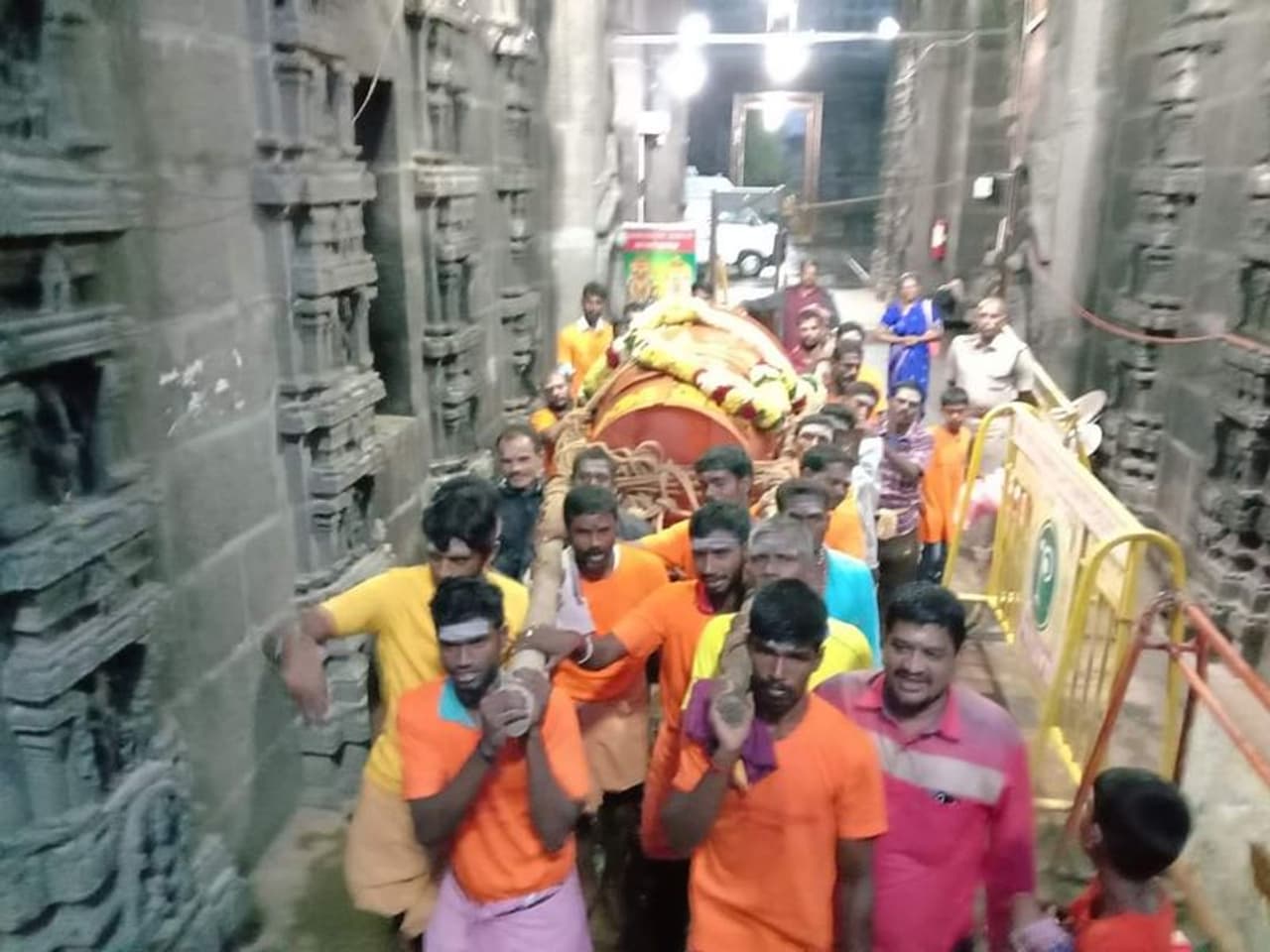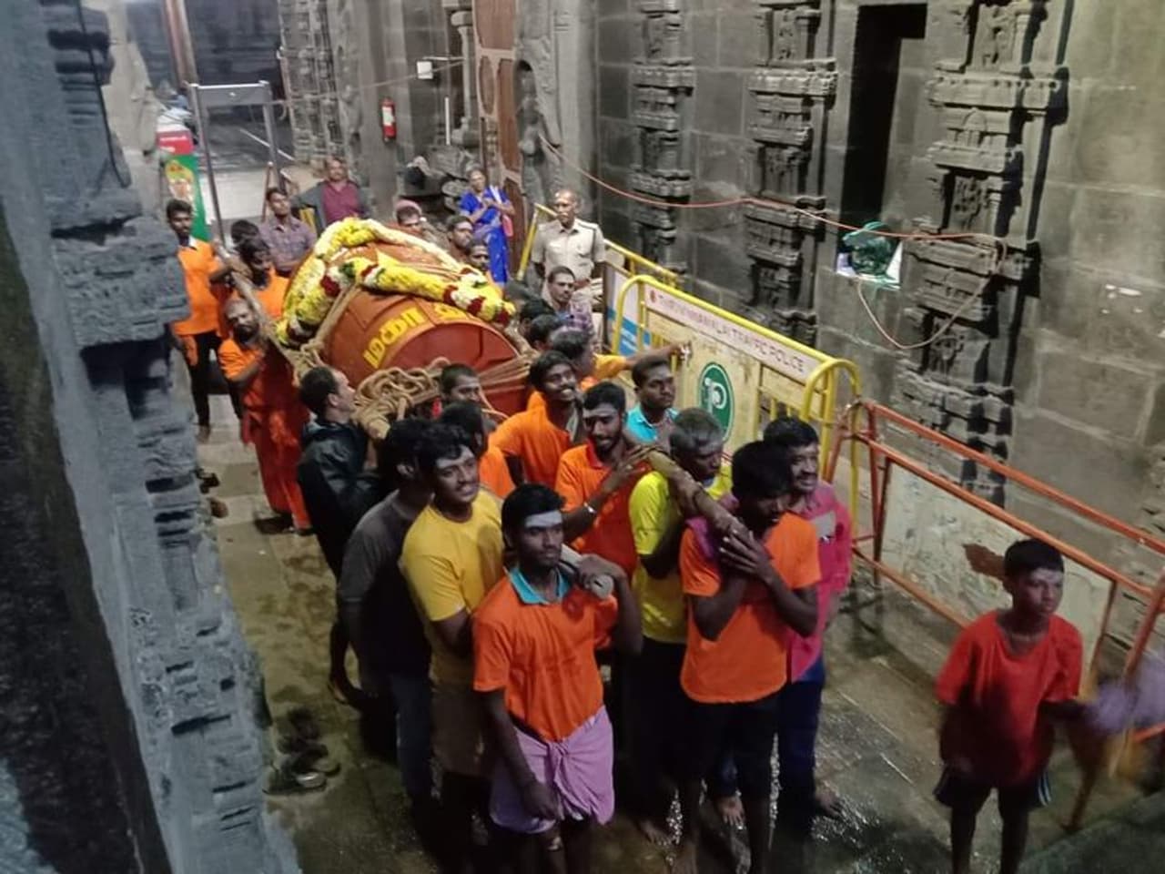 பிறகு, ஊழியர்கள் 15 பேர் மூலமாக 2,668 அடி உயரம் கொண்ட மலை உச்சியின் மீது மகாதீப கொப்பரையை தோளில் சுமந்தபடி சென்றனர். 5.9 அடி உயரமும், 250 கிலோ எடையும் கொண்ட இந்த மகா தீப கொப்பரையானது பஞ்சலோகத்தால் பிரம்மா, விஷ்ணு, சிவன் ஆகிய மூன்று அடுக்குகளாக செய்யப்பட்டது. மகாதீப கொப்பரையில் ஆன்மீக பக்தர்கள் காணிக்கையாக வழங்கப்படும் 3,500 லிட்டர் நெய் மற்றும் 1000 மீட்டர் காடா துணிகளைப் பயன்படுத்தி நாளை மாலை 6 மணிக்கு மகா தீபம் ஏற்றப்பட உள்ளது.