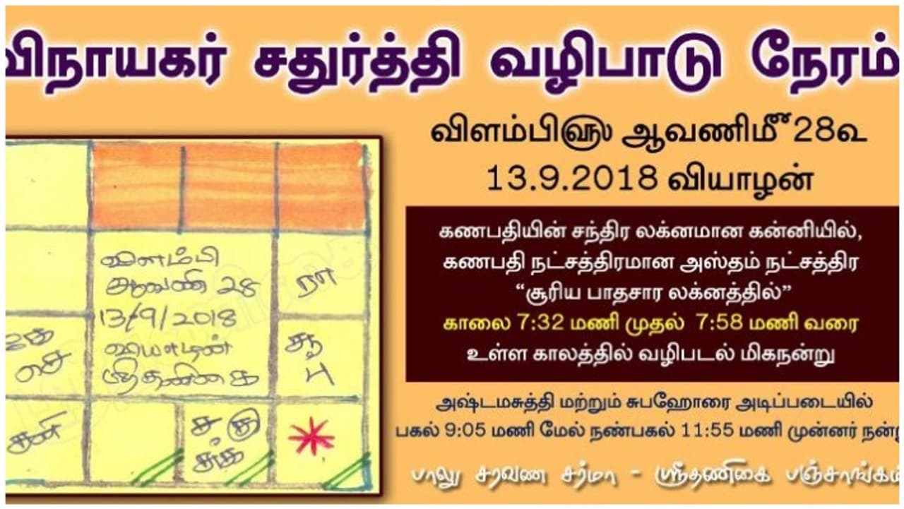 கணபதியின் சந்திர லக்கினமான கன்னியில் கணபதி நட்சத்திரமான அஸ்தம் நட்சத்திர சூரிய பாதசார லக்னத்தில் காலை 7.32 மணியிலிருந்து 7.58 மணி வரை உள்ள நேரத்தில் விநாயகரை வழிப்படுவது மிகவும் நல்லது.