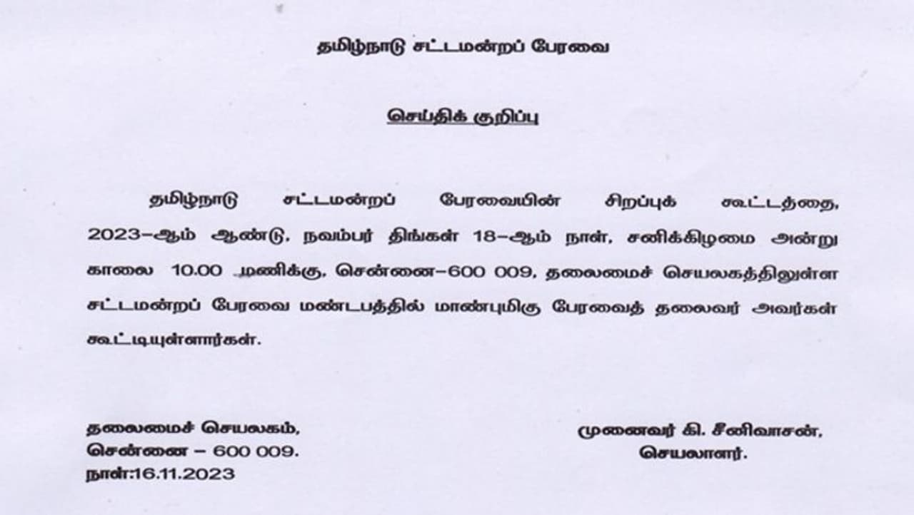 இந்த நிலையில், தமிழக சட்டப்பேரவை சிறப்பு கூட்டத்தொடர் நவம்பர் 18ஆம் தேதி (நாளை மறுநாள்) கூட்டப்படும் என அறிவிப்பு வெளியாகியுள்ளது. அதன்படி, நாளை மறுநாள் காலை 10 மணிக்கு தலைமை செயலகத்தில் உள்ள சட்டமன்றப் பேரவை மண்டபத்தில் சட்டப்பேரவை சிறப்பு கூட்டத்தொடர் கூடவுள்ளது. இதற்கான அறிவிப்பை பேரவை செயலாளர் சீனிவாசன் வெளியிட்டுள்ளார்.