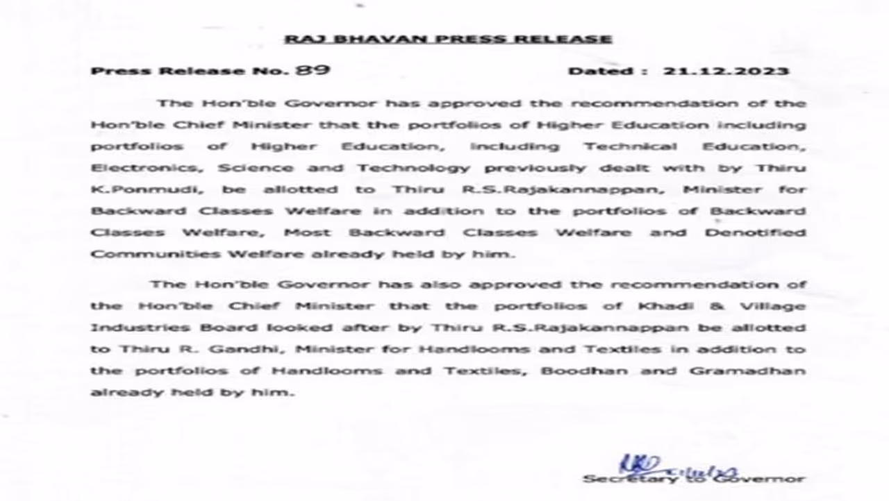 இதையடுத்து, பிற்படுத்தப்பட்டோர் நலன் அமைச்சர் ராஜ கண்ணப்பனுக்கு அமைச்சர் பொன்முடி வகித்து வந்த உயர் கல்வித்துறை கூடுதலாக ஒதுக்கப்பட்டது. இதற்கான பரிந்துரையை ஆளுநர் ஆர்.என்.ரவிக்கு முதல்வர் ஸ்டாலின் அனுப்பி வைத்தார். இந்த நிலையில், அமைச்சர் ராஜ கண்ணப்பனுக்கு உயர்கல்வித்துறையை கூடுதலாக அளிக்கும் முதல்வர் ஸ்டாலினின் பரிந்துரைக்கு ஆளுநர் ஒப்புதல் அளித்துள்ளார்.