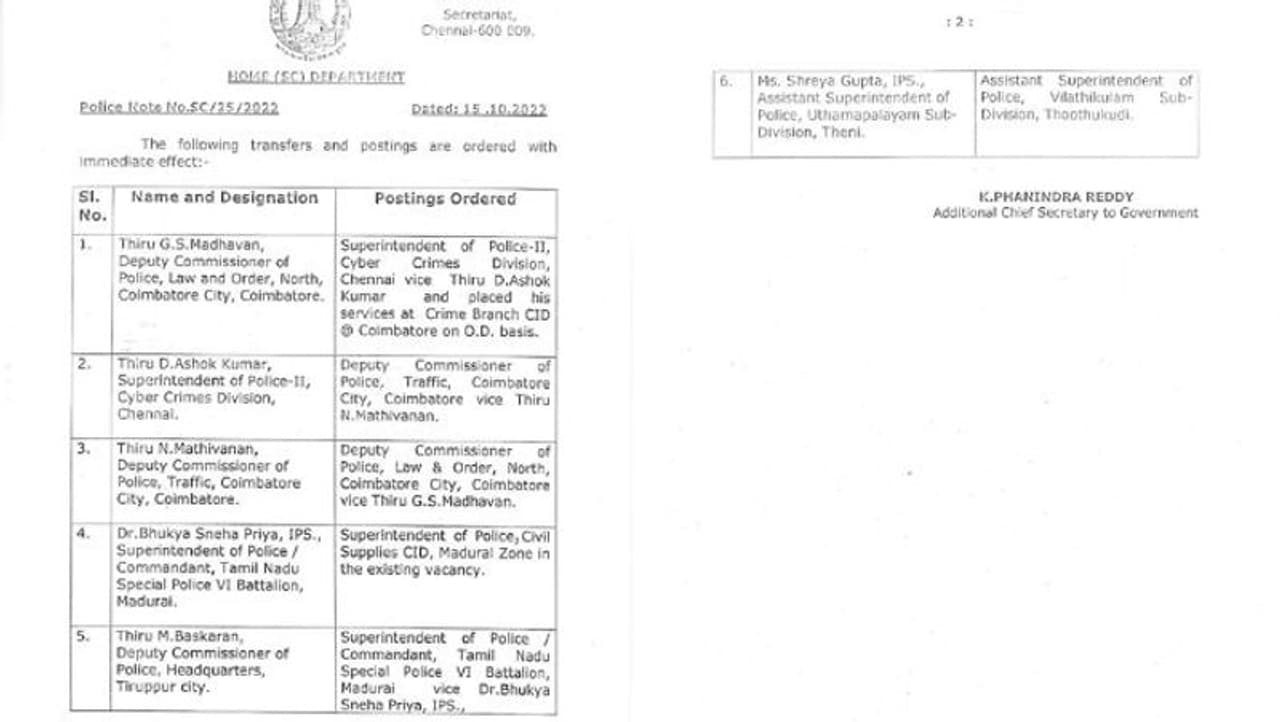 சைபர் கிரைம் பிரிவு எஸ்.பியாக மாதவன், கோவை நகர போக்குவரத்து காவல் துணை ஆணையராக அசோக் குமார், கோவை நகர சட்டம் ஒழுங்கு துணை ஆணையராக மதிவாணன், மதுரை மண்டல குடிமைப்பொருள் வழங்கல் குற்றப்புலனாய்வு எஸ்பியாக புக்யா சினேகா பிரியா, தமிழ்நாடு சிறப்பு காவல்படை 6 ஆவது பட்டாலியன் கமாண்டண்ட் ஆக பாஸ்கரன், விளாத்திகுளம் உதவி எஸ்பியாக ஸ்ரேயா குப்தா பணியிடமாற்றம் செய்யயப்பட்டுள்ளனர்.