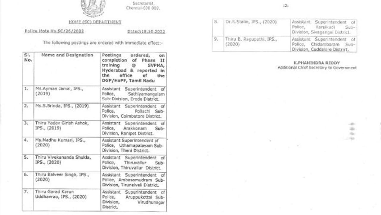 பயிற்சி முடித்த ஐபிஎஸ் அதிகாரிகள் 9 பேருக்கு பணியிடங்கள் ஒதுக்கீடு செய்து தமிழ்நாடு அரசு உத்தரவிட்டுள்ளது. அதன்படி, ஈரோடு மாவட்டம் சத்தியமங்கலம் சப்-டிவிஷன் காவல் துணைக் கண்காணிப்பாளராக ஐபிஎஸ் அய்மன் ஜமால், கோவை மாவட்டம், பொள்ளாச்சி சப் டிவிஷன் காவல் துணைக் கண்காணிப்பாளராக பிருந்தா, ராணிப்பேட்டை மாவட்டம் அரக்கோணம் துணைப் பிரிவுக்கும் ஒதுக்கீடு செய்யப்பட்டுள்ளனர்.