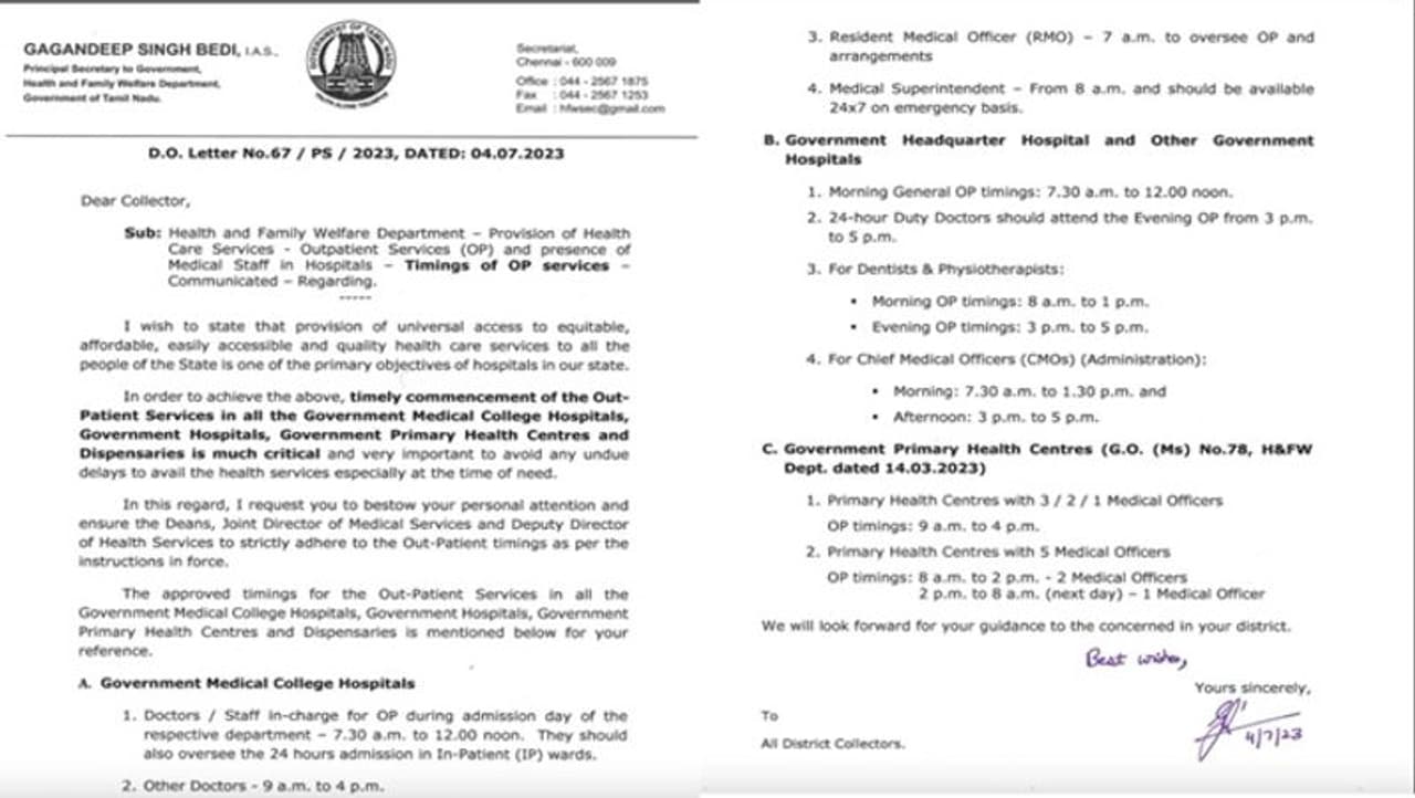 மருத்துவர்களுக்கான நேர அட்டவணையை வெளியிட்டு உத்தரவு பிறப்பித்துள்ள சுகாதாரத்துறை செயலாளர் ககன்தீப்சிங் பேடி, இது தொடர்பாக அனைத்து மாவட்ட ஆட்சியர்களுக்கும் கடிதம் எழுதியுள்ளார். அதில், மருத்துவர்கள் சரியான நேரத்தைக் கட்டாயமாக கடைபிடிப்பதை மாவட்ட ஆட்சியர்கள் உறுதிசெய்ய வேண்டும் என கூறப்பட்டுள்ளது.