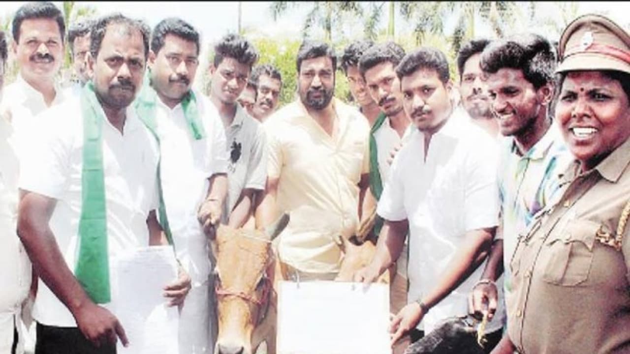 To release students who fought for cauvery - came with goat and cows to give petition ...
