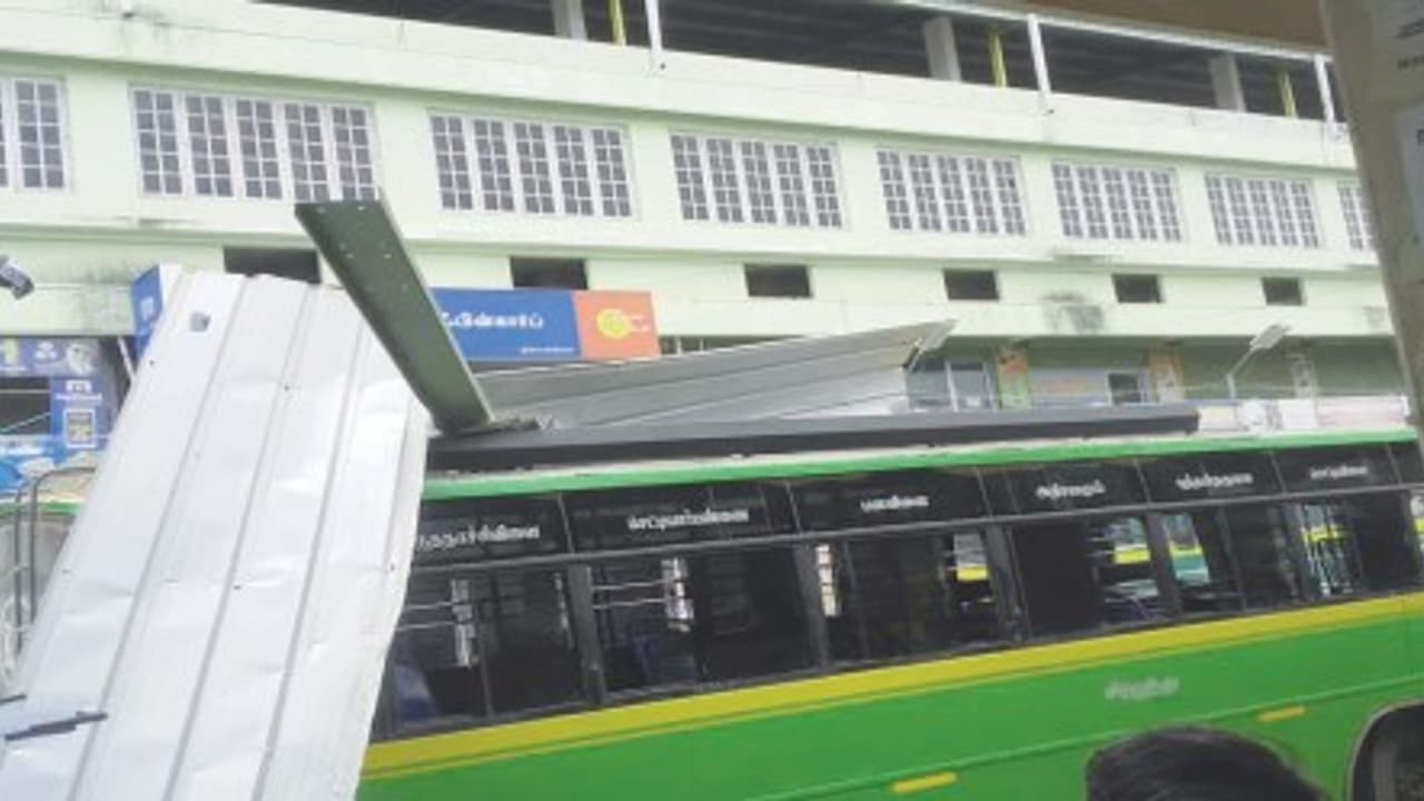 இதில், அங்கு நின்றுக் கொண்டிருந்த மினி பேருந்தின் மீது பலமாக விழுந்தபோது, ஏற்பட்ட அதிபயங்கர சத்தத்தைக் கேட்டும், பேருந்தின் மீது விழுந்ததைக் கண்டும் பேருந்து நிலையத்தில் நின்று கொண்டிருந்த பயணிகள் பெரும் அதிர்ச்சி அடைந்தனர்.