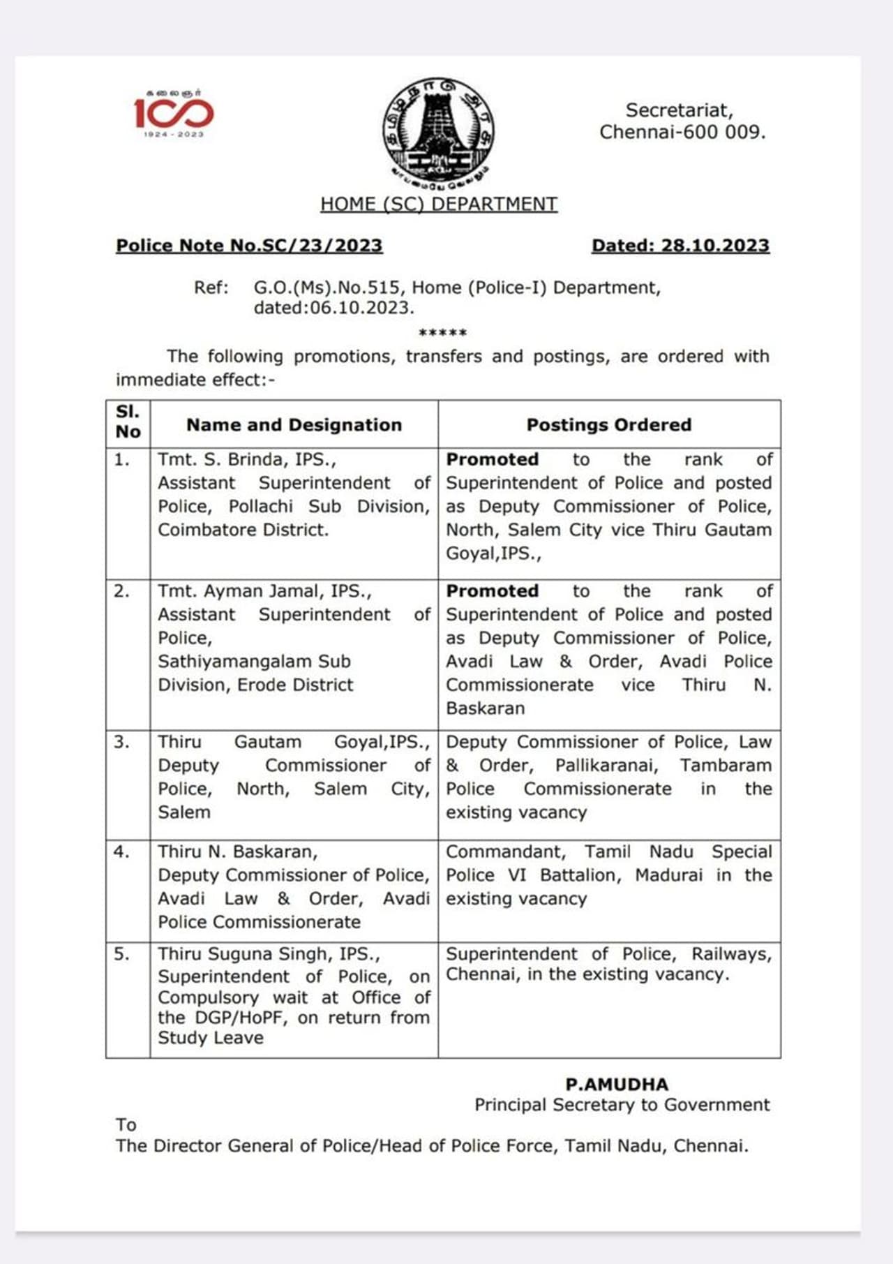 அதிகாரிகள் இடமாற்றம் தொடர்பாக தமிழ்நாடு அரசு சார்பில் வெளியிடப்பட்டுள்ள செய்திக் குறிப்பில், “பொள்ளாச்சி துணை பிரிவு உதவி ஆணையராக இருந்த பிருந்தாவுக்கு எஸ்.பி.ஆக பதவி உயர்வு அளிக்கப்பட்டு சேலம் மாநகர வடக்கு மண்டல துணை ஆணையராக நியமனம் செய்யப்பட்டுள்ளார்.