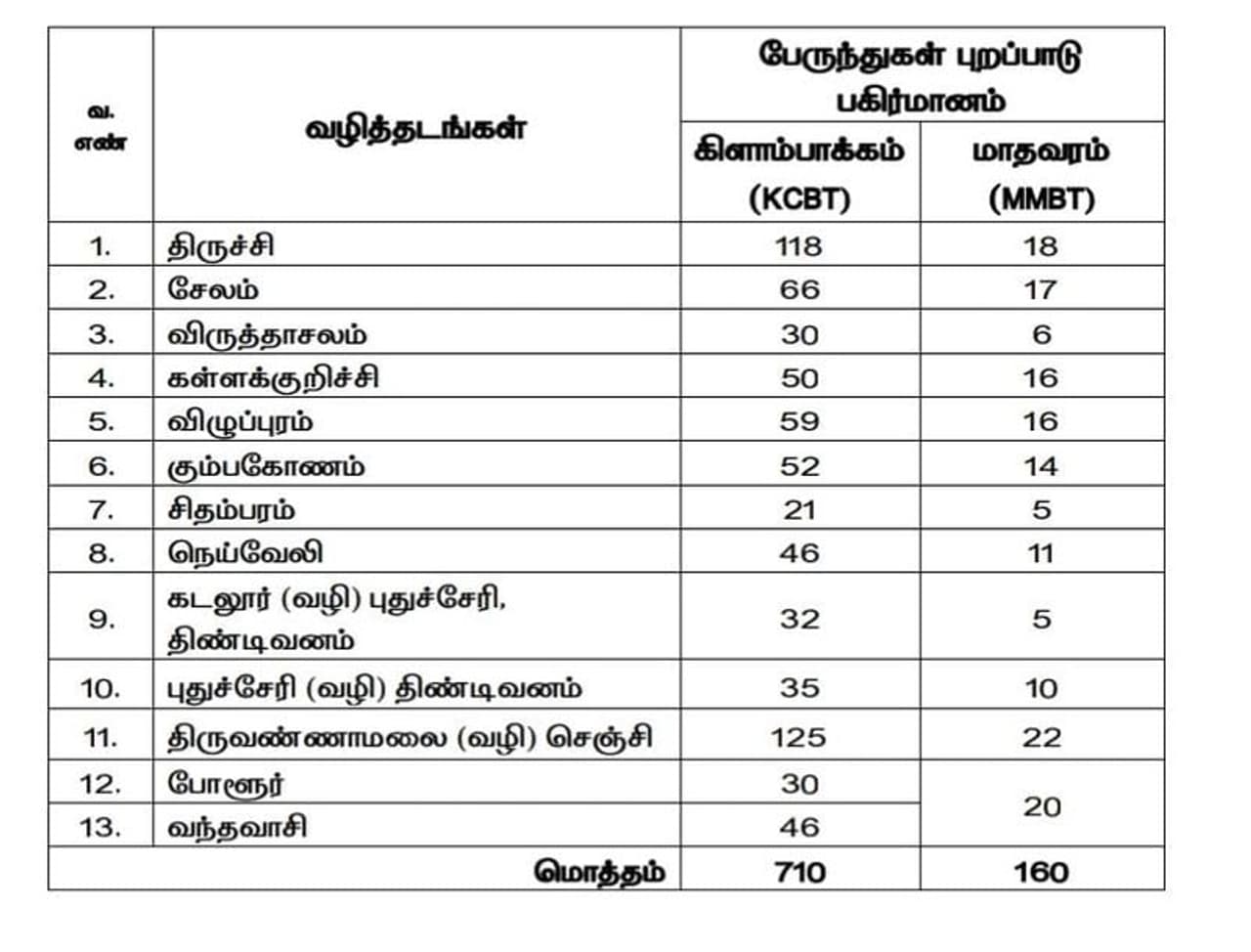 கலைஞர் நூற்றாண்டு பேருந்து முனையம் (KCBT) கிளாம்பாக்கம் மற்றும் மாதவரம் புறநகர் பேருந்து முனையத்திலிருந்து (MMBT) இயக்கப்படும் வழித்தடங்கள் மற்றும் பேருந்து புறப்பாடுகள் எண்ணிக்கை விவரம் பின்வருமாறு: