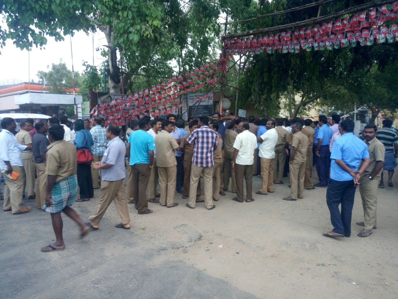 சென்னை திருவொற்றியூர் நெடுஞ்சாலையில் தண்டையார்பேட்டை போக்குவரத்து பணிமனை அருகே ஊழியர்கள் ஆர்ப்பாட்டத்தில் ஈடுபட்டுள்ளனர். இதனால், இந்த பணிமனையில் இருந்து பெரும்பாலான பஸ்கள் இயக்கப்படவில்லை.