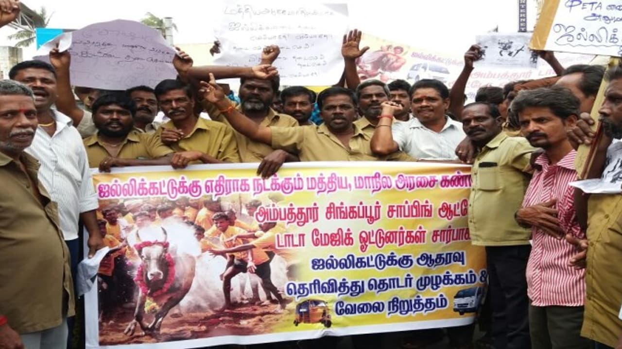 இந்நிலையில், சென்னை மாநகர போக்குவரத்து கழகம் சார்பில் ஆளுங்கட்சியை தவிர அனைத்து கட்சி சங்கத்தினரும், ஜல்லிக்கட்டுக்கு ஆதரவு தெரிவித்து போராட்டத்தில் குதித்துள்ளனர்.