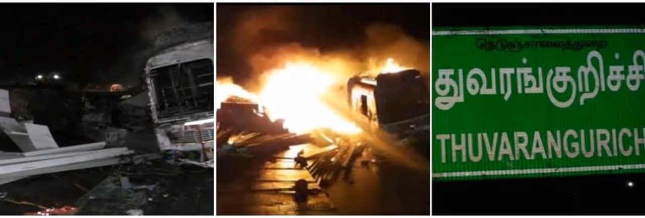 இதன் காரணமாக திருச்சி - மதுரை தேசிய நெடுஞ்சாலையில் சிமெண்ட் ஏற்றிக்கொண்டு திருநெல்வேலி மாவட்டம், வள்ளியூருக்கு சென்ற லாரி மீது மோதி விபத்துக்குள்ளானது. இந்த விபத்து ஏற்பட்ட சில நிமிடங்களில் இரண்டு லாரிகளும் தீயானது பரவியது. இதன் காரணமாக அதிர்ச்சி அடைந்த மற்ற வாகனங்கள் ஓரமாக நிறுத்தப்பட்டது. இதனையடுத்து துவரங்குறிச்சி தீயணைப்பு துறையினருக்கு தகவல் தெரிவிக்கப்பட்டது. தெரிவித்தனர். இந்நிலையில் டாரஸ் லாரியில் இருந்த ஒருவர் உடலில் பற்றி எரியும் நெருப்புடன் தேசிய நெடுஞ்சாலையை கடந்து அருகில் உள்ள காட்டுப் பகுதியில் சுருண்டு விழுந்து உயிரிழந்தார்.