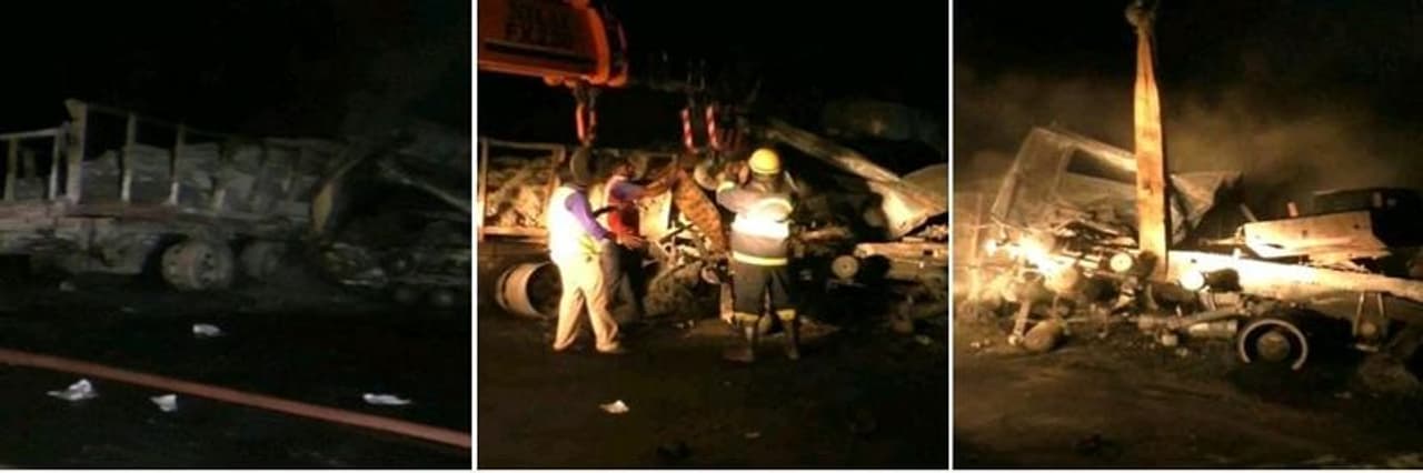 மணப்பாறை அருகே தேசிய நெடுஞ்சாலையில் இரண்டு லாரிகள் நேருக்கு நேர் மோதியதில் லாரிகளில் தீப்பிடித்தது. இந்த தீ விபத்தில் இருவர் உடல் கருகி பலியான சம்பவம் பரபரப்பை ஏற்படுத்தியுள்ளது.
