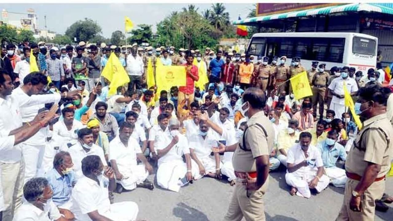 போராட்டத்தில் ஈடுபட்டவர்கள், அதிகாரிகள் அக்னி கலசத்தை ஏற்கெனவே இருந்த இடத்தில் வைக்க வேண்டும் என்று வலியுறுத்தினர். போராட்டத்துக்கு தலைமை வகித்த வன்னியர் சங்க மாநிலத் தலைவர் பு.தா.அருள்மொழி, போராட்டத்தில் கலந்துகொண்ட பாமகவினர் மற்றும் வன்னியர் சங்கத்தினரிடம் கூறுகையில், ‘அமைதியை உருவாக்க வேண்டிய வருவாய்த்துறை அதிகாரிகள், எல்லா மக்களும் அமைதியாக நன்றாக வாழ்வதற்கு அமைதியான சூழ்நிலையை உருவாக்க வேண்டிய வருவாய்த்துறை அதிகாரிகள், இங்கே இருந்த அக்னி கலசத்தை இரவோடு இரவாக திருடர்களைப் போல எடுத்துச் சென்றுவிட்டார்கள்.