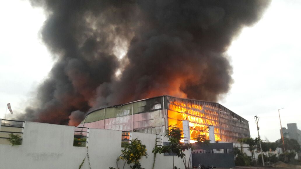 தொழிற்சாலையில் இருந்து வெளிவரும் தீயால் அந்த பகுதியே புகை மூட்டமாய் காட்சியளிக்கிறது.