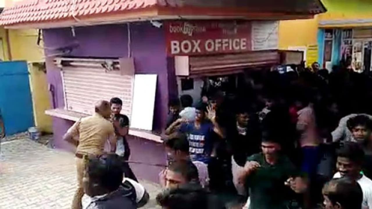 ரசிகர்கள் கூட்டம் அளவுக்கு அதிகமாக இருந்ததால் டிக்கெட் வாங்குவதில் தள்ளுமுள்ளு ஏற்பட்டு மோதல் உருவானது. இதை சமாளிக்க போலீசார் தடியடி நடத்தினர். இதனால், அங்கு பரபரப்பு ஏற்பட்டது.
