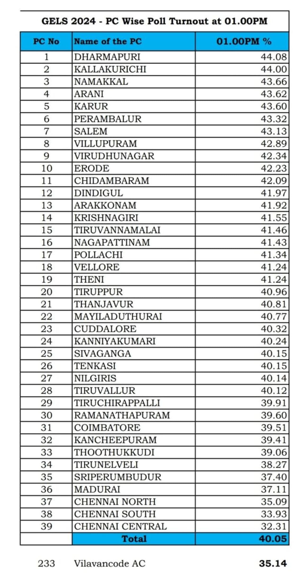 இதனையடுத்து காலை 11 மணியளவில், 24.37% வாக்குகள் பதிவாகியிருந்தது. ஆரம்பத்தில் இருந்து கள்ளக்குறிச்சி மற்றும் தருமபுரி தொகுதியில் வாக்காளர்கள் ஆர்வமோடு வாக்களித்து வருகின்றனர். அதே நேரத்தில் சென்னையில் உள்ள மத்திய சென்னை, வட சென்னை மற்றும் தென் சென்னை ஆகிய தொகுதிகளில் வாக்கு சதவிகிதம் மிகவும் குறைவாக காணப்பட்டது. இந்தநிலையில் மதியம் 1 மணி நிலவரப்படி தமிழகம் முழுவதும் 40.05 % வாக்குகள் பதிவானது. அதிகபட்சமாக தரும்புரியில் 44.08 சதவிகிதமும், கள்ளக்குறிச்சியில் 44% பதிவாகியுள்ளது. அதே நேரத்தில் மத்திய சென்னையில் -32.31 சதவிகிதமும், தென் சென்னையில் 33.93 சதவிகிதமும், வட சென்னையில் 35.09 சதவிகிதமும் வாக்குகள் பதிவாகியுள்ளது.