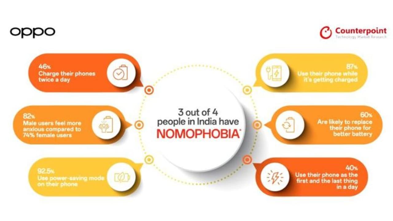 இந்தியாவில் நான்கு பேரில் மூன்று பேருக்கு நோமோபோபியா உள்ளது, அவர்கள் ஸ்மார்ட்போனிலிருந்து துண்டிக்கப்படுவார்கள் என்ற பயம், உலகளாவிய ஸ்மார்ட் சாதன பிராண்டான OPPO மற்றும் கவுண்டர்பாயிண்ட் ரிசர்ச் ஆகியவற்றின் அறிக்கை மூலமாக தெரிய வந்துள்ளது.
