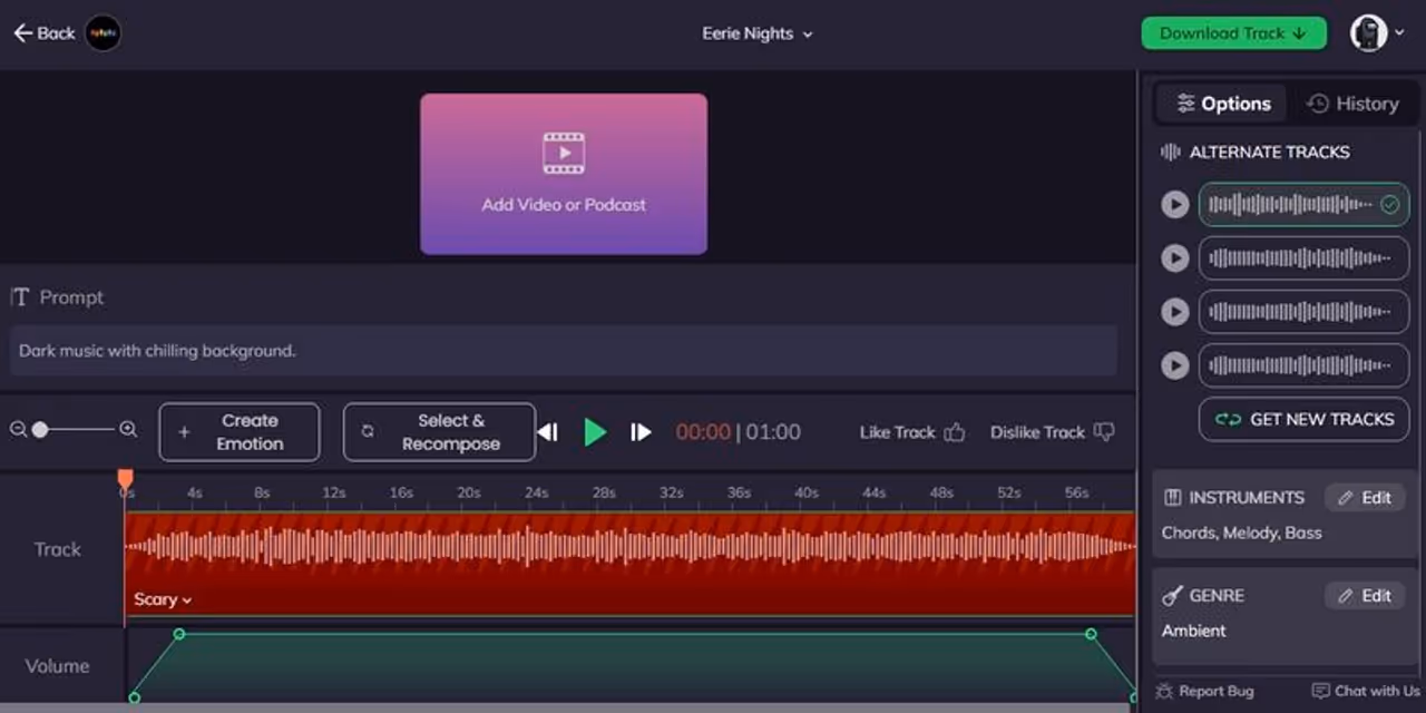 இந்த AI மியூசிக் ஜெனரேட்டரில் சில நொடிகளில் புதிய இசையை உருவாக்கலாம். லாக்-இன் செய்யவும் தேவையில்லை. இதில் உங்களுக்குப் பிடித்த இசை வகையைத் தேர்வுசெய்து, இரண்டு கீவேர்டுகளைக் குறிப்பிட்டால் போதும். அதற்கு ஏற்ப இசையை தயாரித்துக் கொடுத்துவிடும்.
