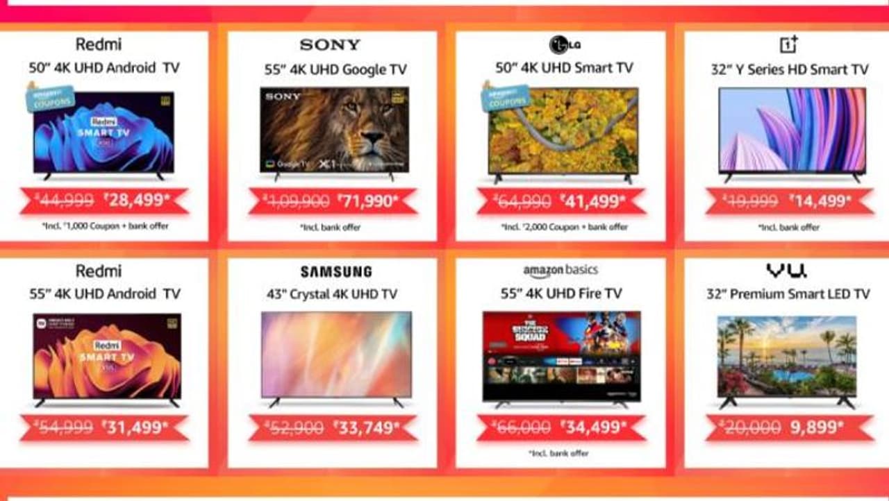 தேர்வு செய்யப்பட்ட வங்கி கிரெடிட் கார்டுகளை பயன்படுத்தி ஸ்மார்ட் டி.வி. வாங்கும் போது ரூ. 1500 உடனடி தள்ளுபடி வழங்கப்படுகிறது. இத்துடன் பிடித்தமான டி.வி. மாடல்களை வாங்கும் வாடிக்கையாளர்கள் அமேசான் பே ரிவார்டு பயன்படுத்தும் போது 10 சதவீதம் அதிகபட்சம் ரூ. 200 வரை தள்ளுபடி பெற முடியும்.
