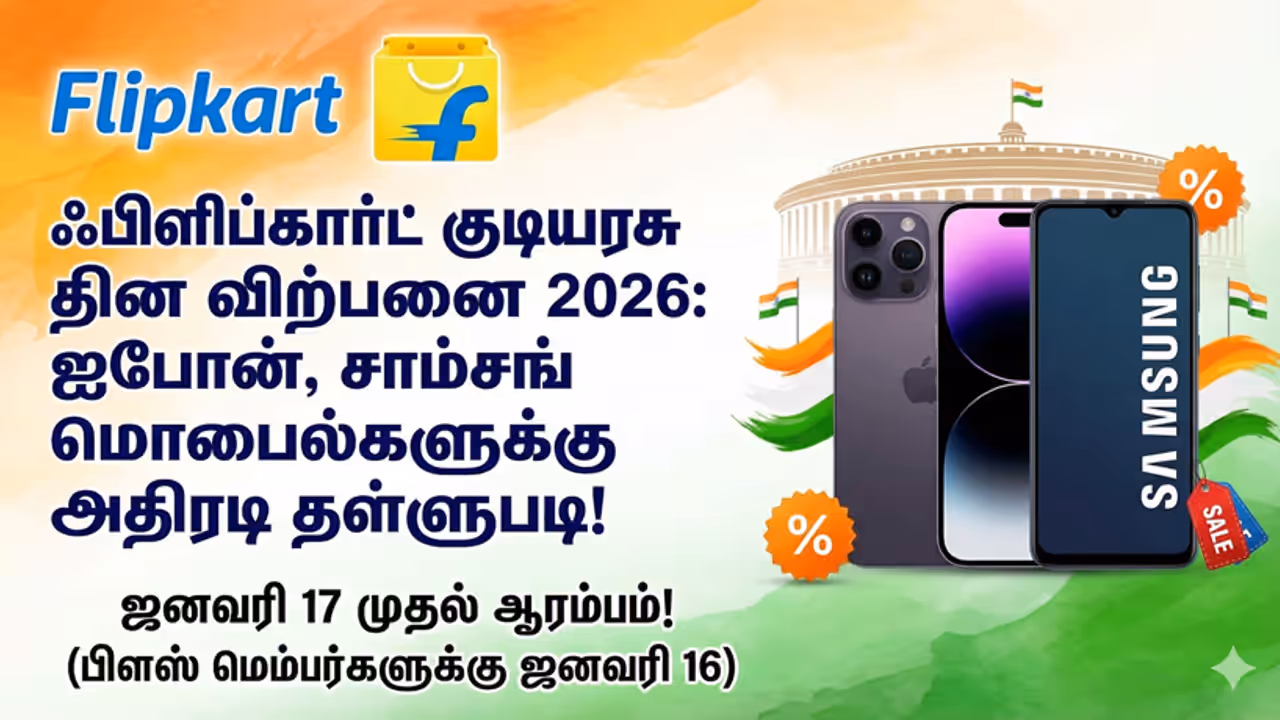 Flipkart ஃபிளிப்கார்ட் குடியரசு தின விற்பனை 2026 ஜனவரி 17 தொடங்குகிறது. ஐபோன், சாம்சங் மொபைல்களுக்கு பெரிய தள்ளுபடி மற்றும் வங்கி சலுகைகள் பற்றி இங்கே அறியுங்கள்.